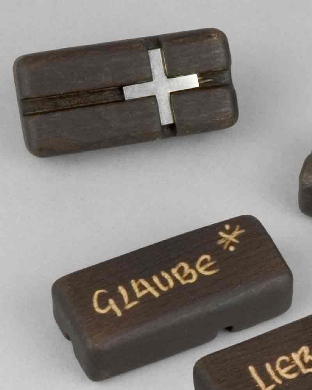 Festhaltekreuz „Glaube“, 65 x 32 x 20 mm, im Samtbeutel. Das Festhaltekreuz kann uns in einer besonderen Notsituation oder in einer Phase der Verunsicherung und Belastung begleiten. Die Kanten des eingekerbten Kreuzes geben über das Tasten der Finger spürbare Impulse der Orientierung und Kontur. Beim Festhaltekreuz ist Metall in das Holz eingelassen. Im Dunkel erscheint hell das Zeichen des Heils. Auf einer schwierigen Wegstrecke im Leben sind dies wichtige und hilfreiche Aspekte, die sich sinnlich vermitteln. Das dem Kreuz eingeschriebene Segenswort möge als eine stützende und heilende Kraft in denen wirksam sein, die es bei sich tragen und immer wieder in die Hand nehmen.