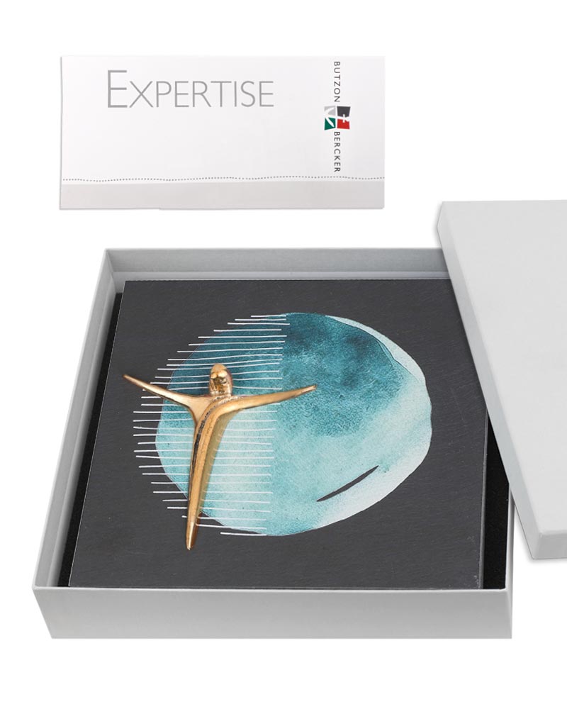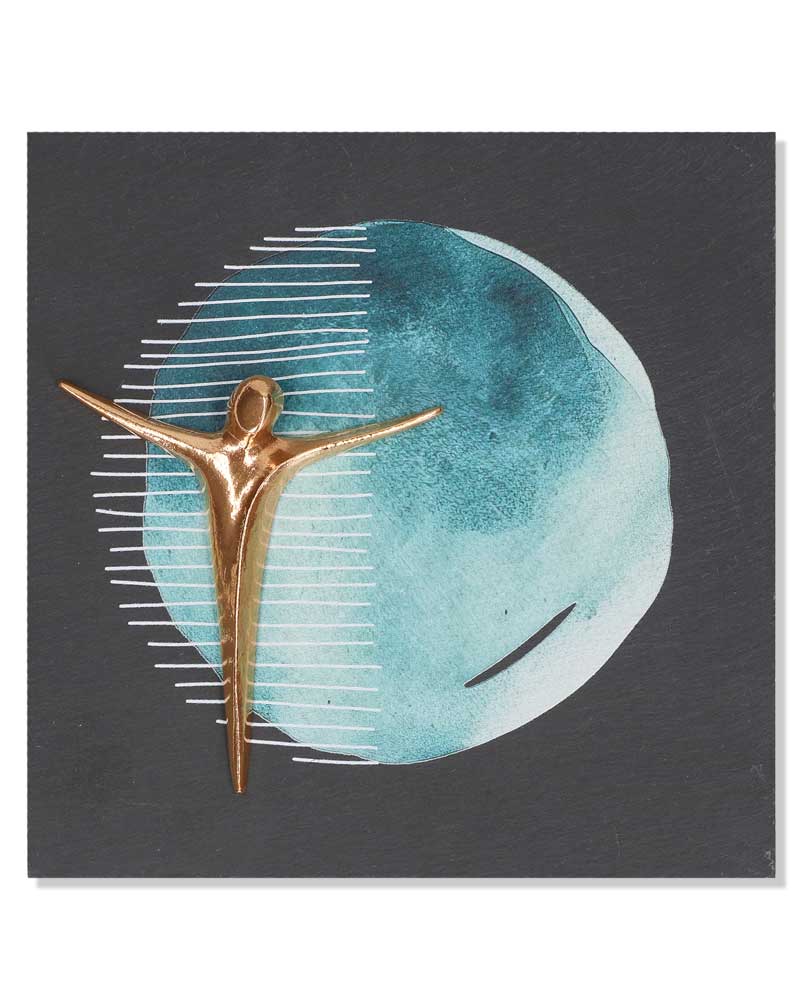 Das quadratische Schieferrelief (17 x 17 cm) zeigt einen stilisierten Korpus aus Bronze auf farbig bedrucktem Naturschiefer. Der bronzene Christus ist reduziert dargestellt und ruht in einem blauen Kreis als grafischem Element. Die Gestaltung geht auf ein Modell der Künstlerin Kerstin Stark zurück. Das Relief eignet sich als modernes Wandkreuz für sakrale Räume oder als christliches Geschenk. Die Kombination aus Naturstein und Bronze verleiht dem Objekt eine schlichte Ausdruckskraft. Rückseitig ist eine Aufhängevorrichtung integriert. Die hochwertige Ausführung sowie das symbolhafte Design unterstützen eine zeitgemäße christliche Raumgestaltung.