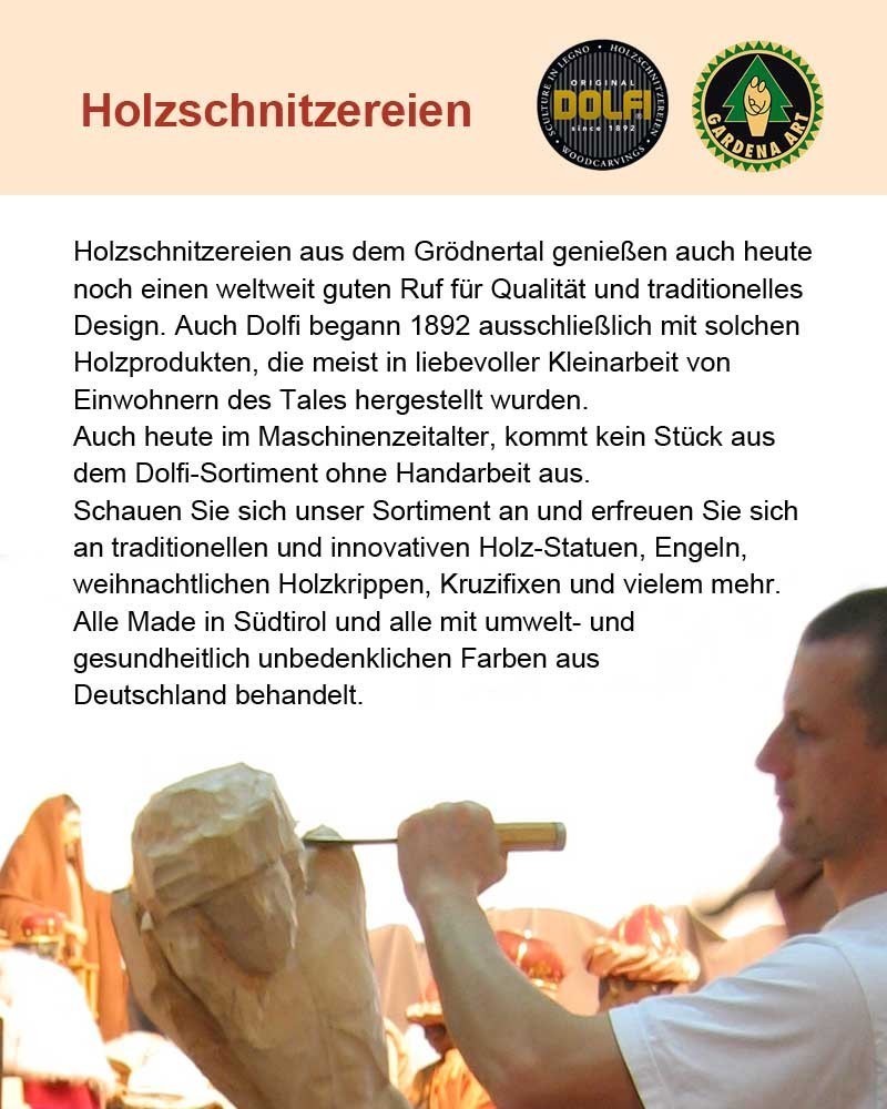 Mit dem Kauf dieser Holzschnitzerei bestätigen wir dass Sie eine echte DOLFI-Skulptur von Bildhauermeistern des Grödner Tales besitzen. Hinter allen Figuren steckt eine sehr große Innovation und viel Arbeit. Der gesamte Arbeitsprozess in der Holzschnitzkunst ist aufwendiger als man meinen möchte. Bis eine Holzfigur fertig geschnitzt, nachgearbeitet, lackiert, bemalt und vergoldet ist, sind im Schnitt mindestens 150 Handgriffe notwendig.
