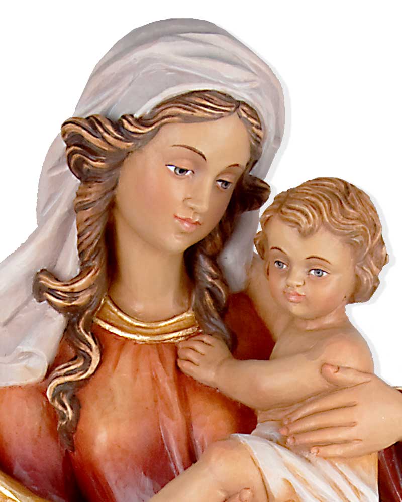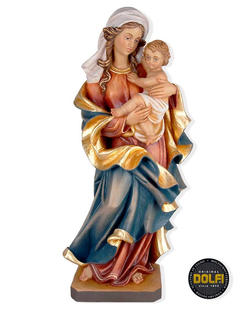 Heiligenfigur "Madonna des Herzens" , mit Jesuskind. Diese Heiligenfigur ist in einer liebeswürdeige Darstellung aus Holz geschnitzt. Die Oberfläche wurde in detailreicher Handarbeit, mit hochwertigen Farben coloriert.