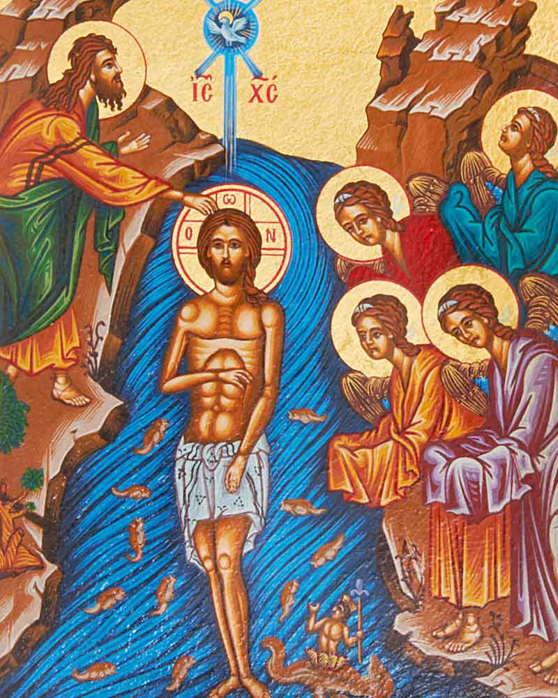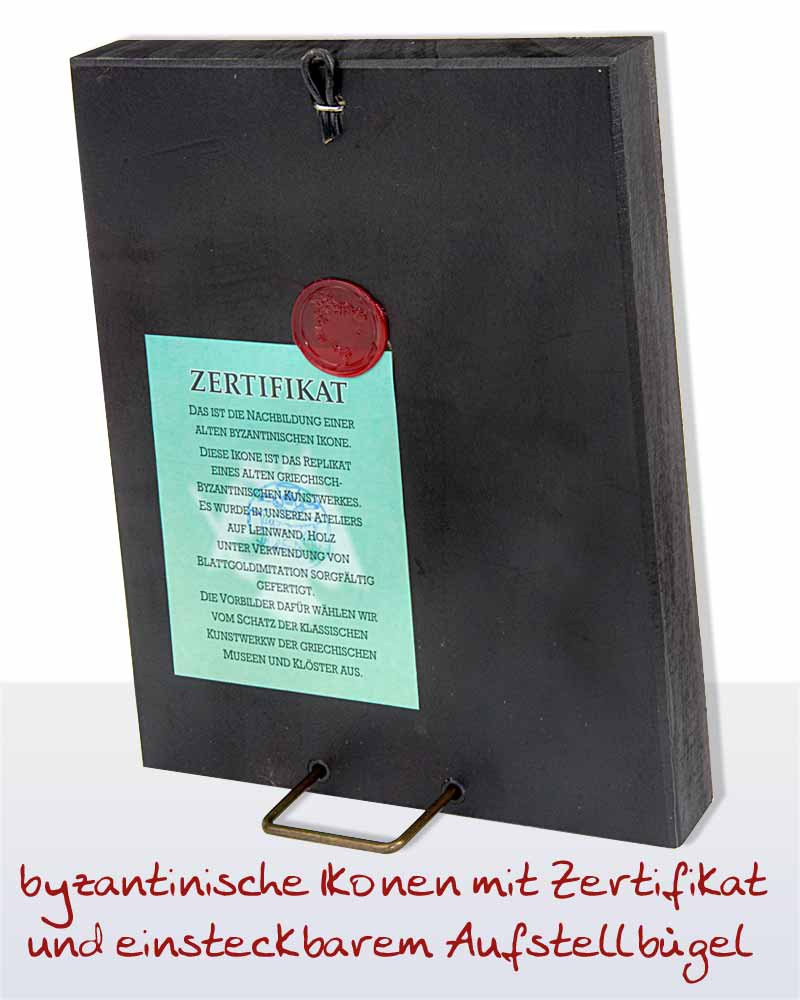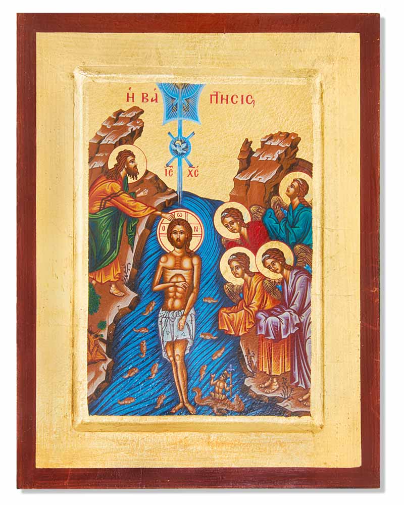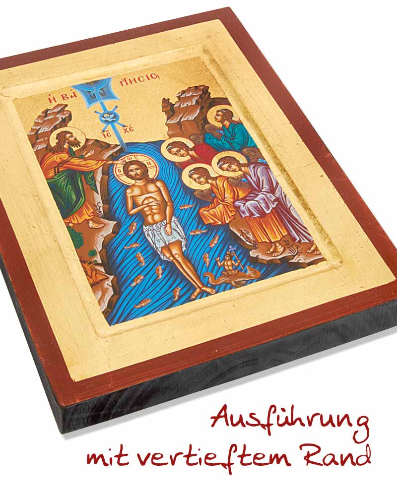 Ikone „Taufe Jesu“ , mit Vertiefung, byzantinisch, erstellt im Siebdruckverfahren, antik. 17 x 22 cm. Mit Aufhängevorrichtung auf der Rückseite sowie mit einsteckbaren Aufstellbügeln versehen.