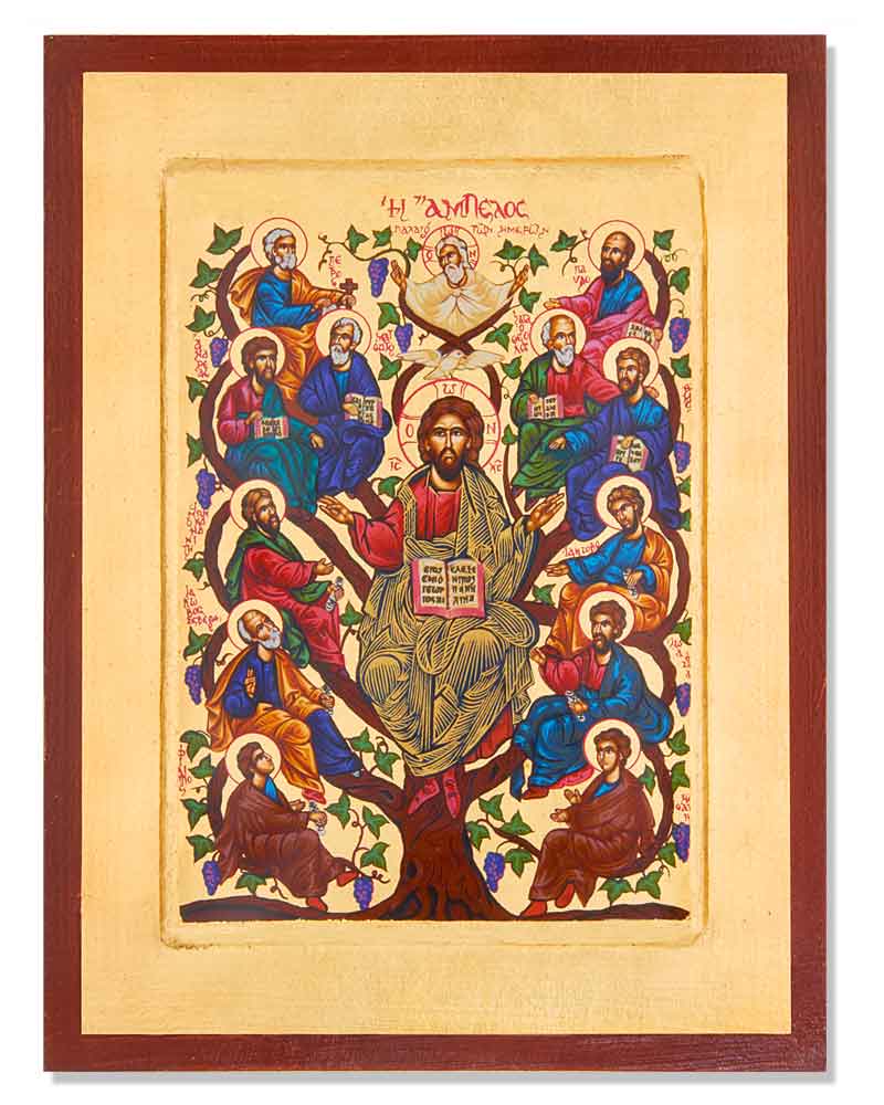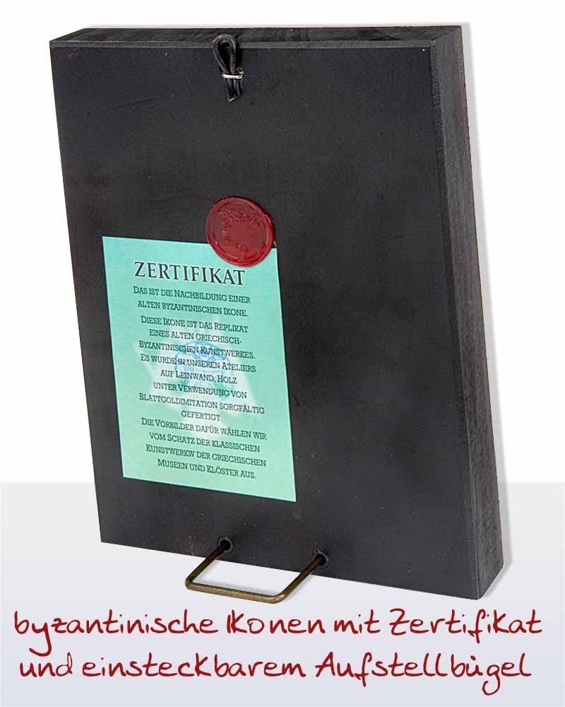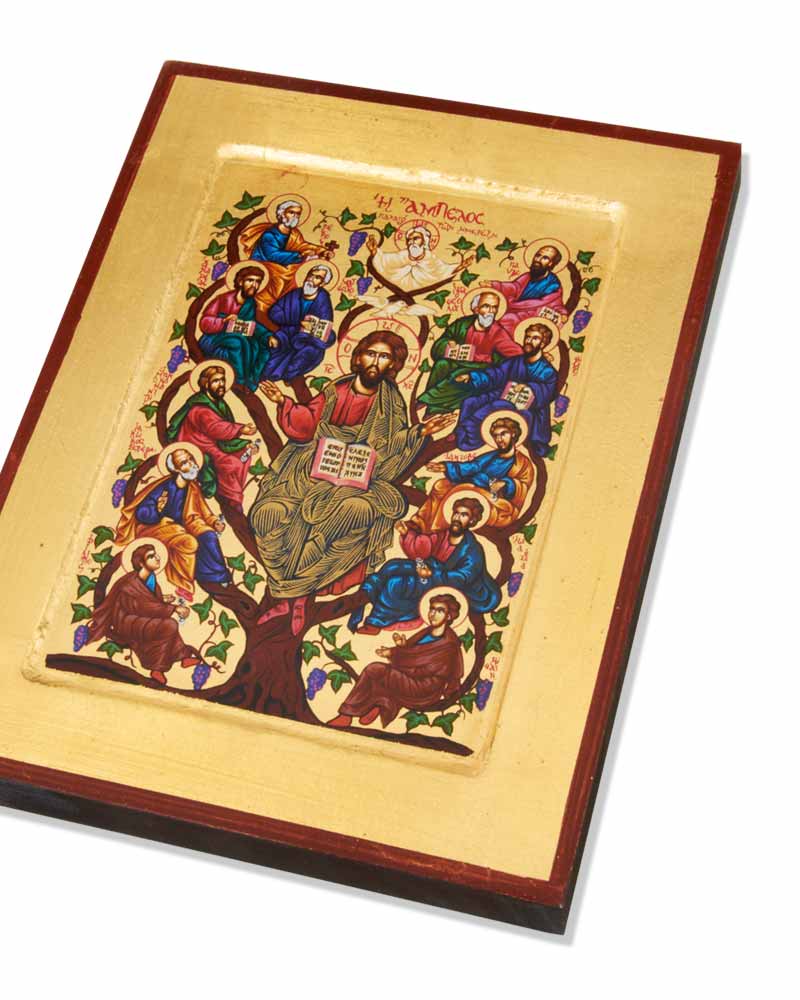 Ikone „Weinstock“ , mit Vertiefung, byzantinisch, erstellt im Siebdruckverfahren, antik, 17 x 22 cm. Mit Aufhängevorrichtung auf der Rückseite sowie mit einsteckbaren Aufstellbügeln versehen.