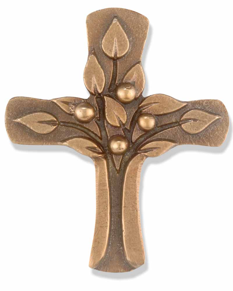 Reliefkreuz mit Lebensbaumsymbolik, "Früchte des Lebens", 8 x 9 cm. Wertvolle Kommunionandenken aus solidem Messing, in zeitgemäßer Gestaltung und vollplastischem Reliefdekor, mit verdeckter Aufhängevorrichtung.