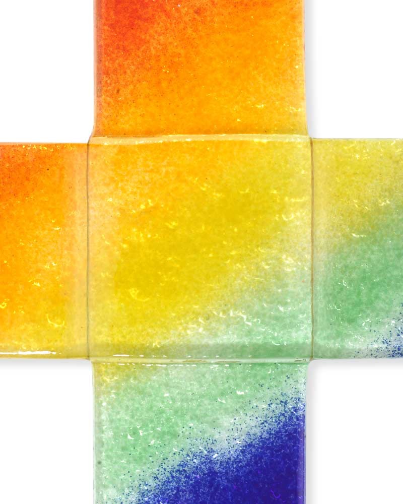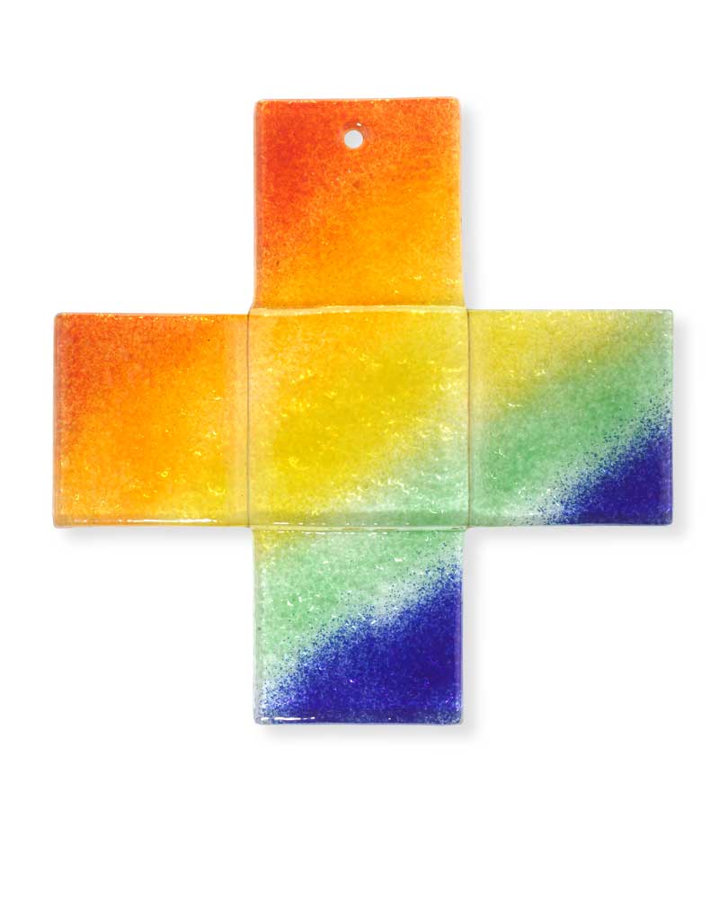 Glaskreuz in Regenbogenfarben gearbeitet, 15 x 15 cm. Jedes Stück ein Unikat! Diese liebevoll von Hand gearbeiteten Kreuze wurden in Fusingtechnik gefertigt.