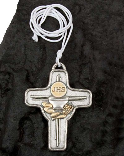 Kommunionkreuz, Relief mit eucharistischer Symbolik, versilbert und ziervergoldet, 6 x 7,5 cm, mit weißer Kordel, in Einzelverpackung.