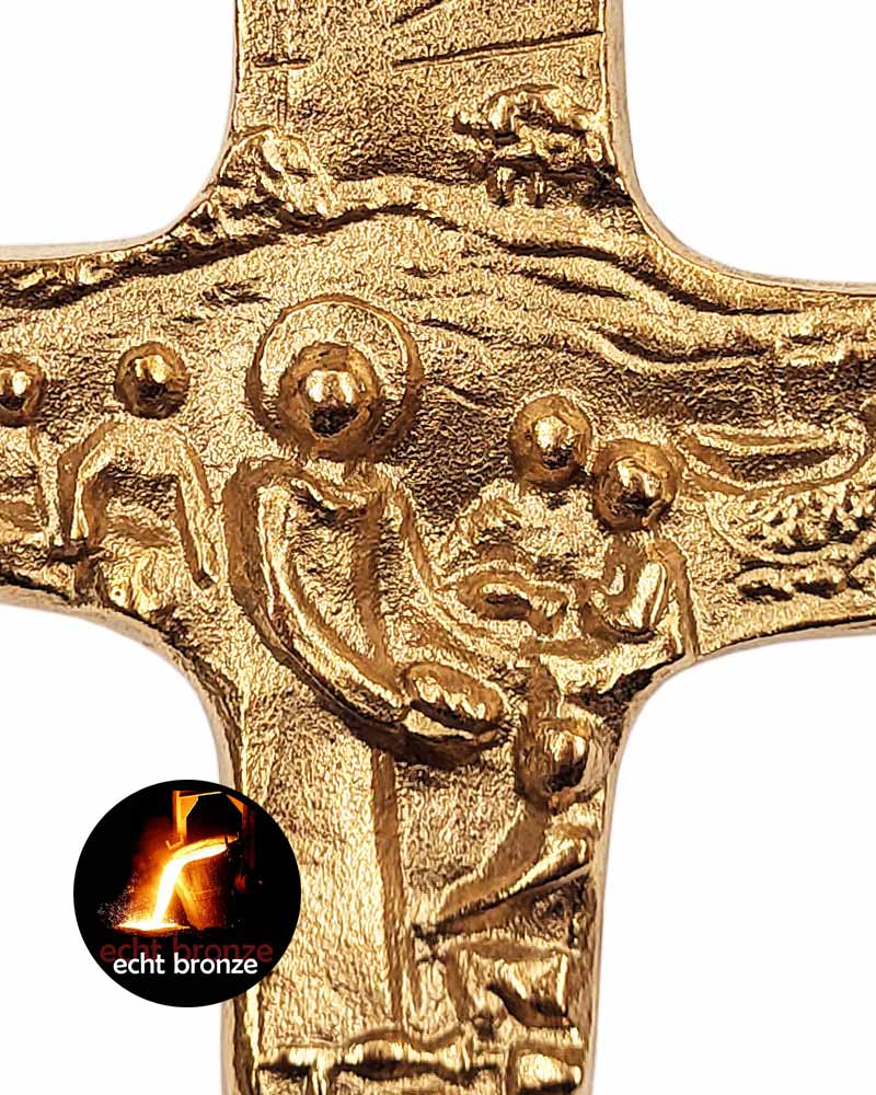 Das Kommunionkreuz „Kommt und esst“ aus Bronze misst 9 x 7 cm und ist als kleines Andachtskreuz oder Geschenk zur Erstkommunion geeignet. Die kompakte Größe prädestiniert es für Kinderzimmer, Hausaltar oder persönliche Gebetsecke. Das Motiv greift die Einladung Jesu zur Gemeinschaft auf und verweist auf die Eucharistie. Die Ausführung in massiver Bronze sorgt für Stabilität und Langlebigkeit. Klare Konturen und eine sorgfältige Reliefgestaltung unterstreichen die Aussage des Motivs. Das Bronzekreuz wird als Einzelstück geliefert und eignet sich als bleibendes Erinnerungszeichen an die Feier der Heiligen Kommunion.