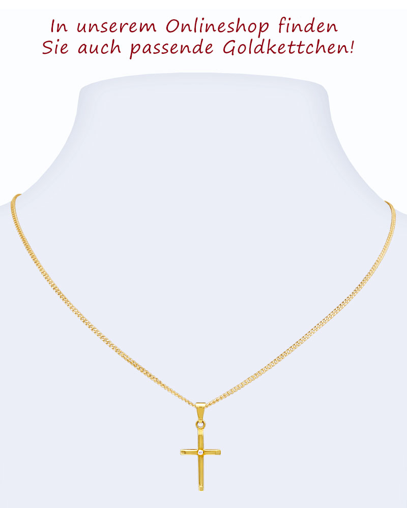 Der Kreuzanhänger aus 9 ct Gold (375) misst 12 x 18 mm und eignet sich als dezenter, hochwertiger Schmuckanhänger. Gefertigt aus massivem Gelbgold, zeigt der Anhänger ein schlichtes Kreuzdesign mit einem mittig eingefassten Zirkoniastein, der dem Stück eine edle Ausstrahlung verleiht. Die feine Verarbeitung und das kompakte Format machen ihn ideal für den täglichen Gebrauch oder als christlicher Schmuck zu besonderen Anlässen. Durch das verwendete Echtgold ist der Anhänger langlebig, wertbeständig und hautverträglich. Passend für feine Goldketten mit kleinem Ösendurchmesser.