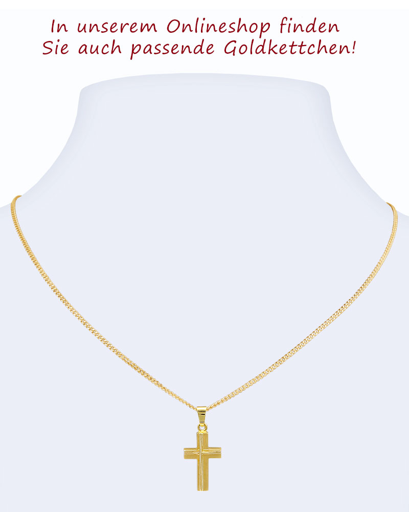 Dieser Kreuzanhänger aus 9 Karat Gold (375) hat eine Größe von 12 x 18 mm und zeigt ein schlichtes Design mit angedeuteten Stegen an den Kreuzenden. Die glänzend polierte Oberfläche verleiht dem Kreuz eine klare, wertige Optik. Gefertigt aus massivem Gold, ist der Anhänger robust und langlebig. Die stabile Öse ermöglicht das Tragen an einer feinen Goldkette. Das zurückhaltende Design macht diesen Kreuzanhänger zu einem zeitlosen Stück christlichen Schmucks, das sowohl im liturgischen Kontext als auch im Alltag getragen werden kann.