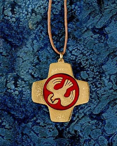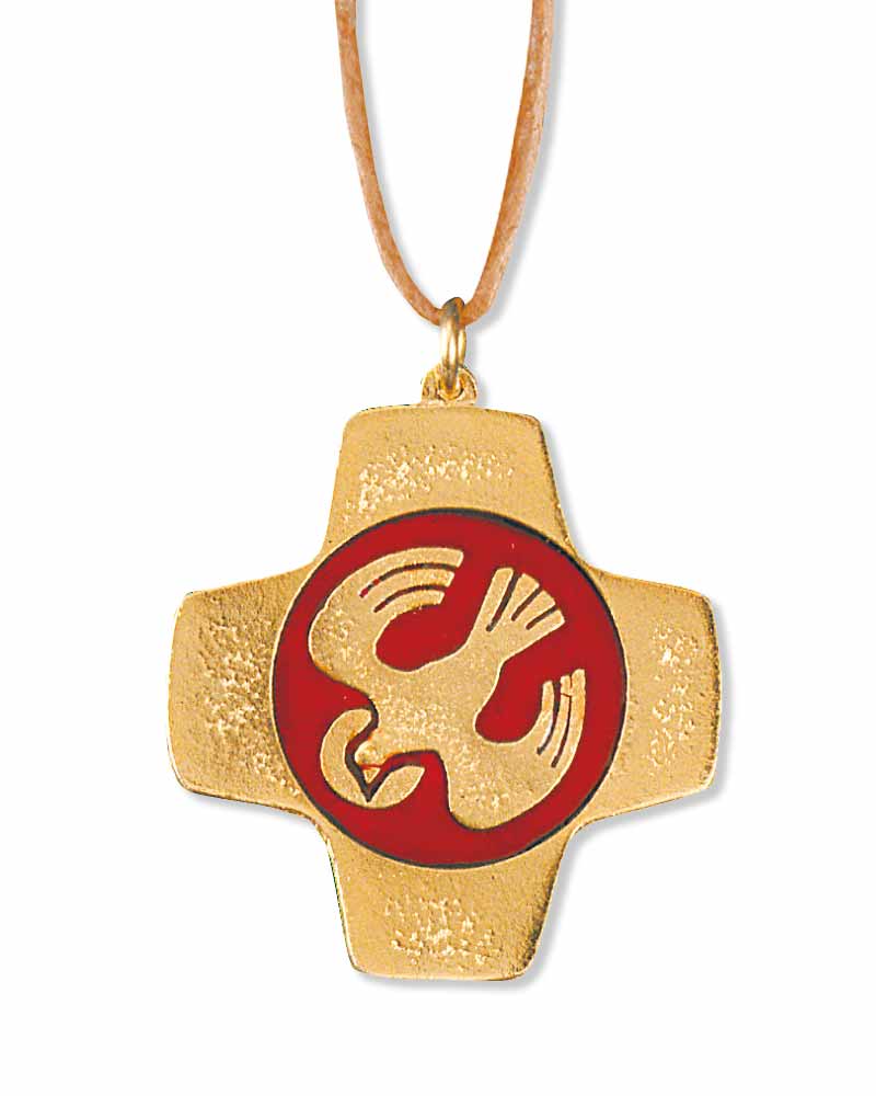 Umhängekreuz "Hl. Geist" 4,5 x 4,5 cm vergoldet mit rotem Kaltemail.