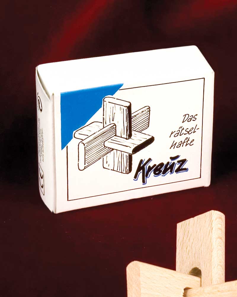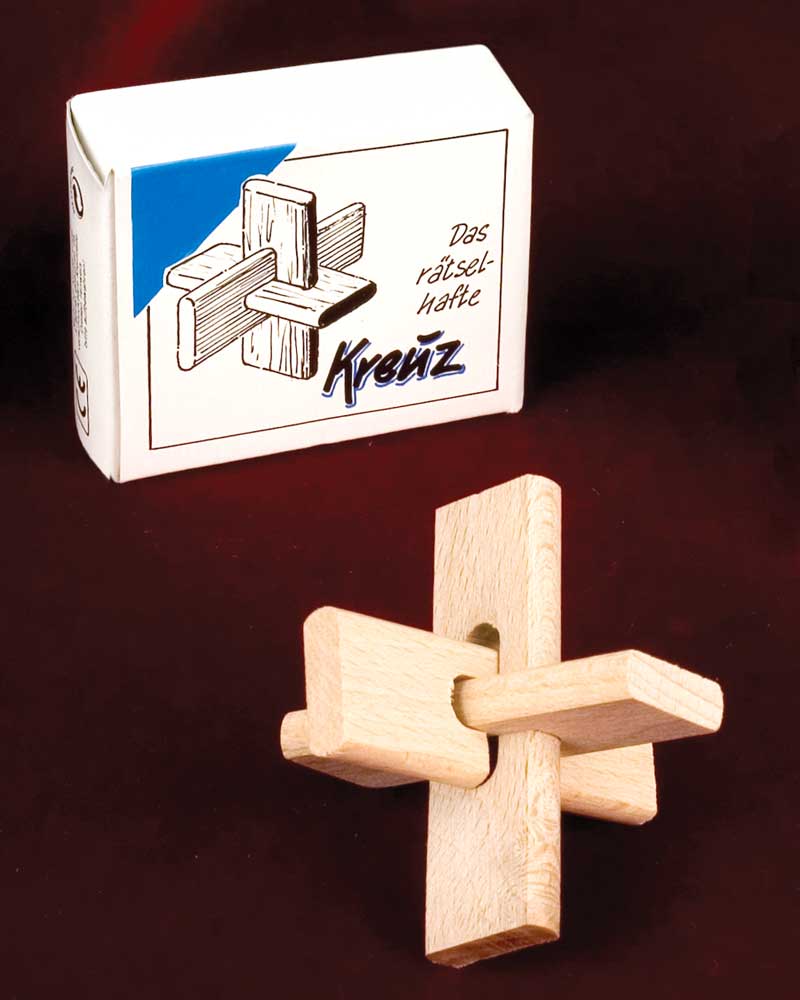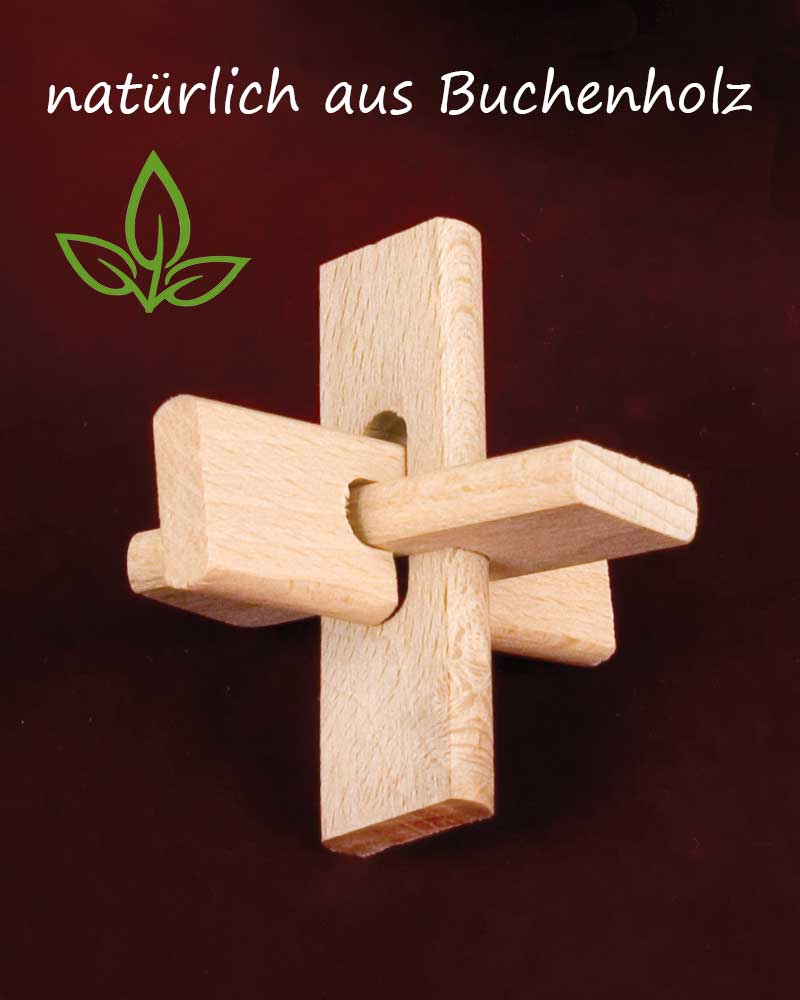 Das rätselhafte Kreuz. Kreuzknoten aus Naturholz. Drei Teile werden zu einem drei dimensionalen Holzkreuz zusammengebaut. Geeignet für Kinder ab 8 Jahren.