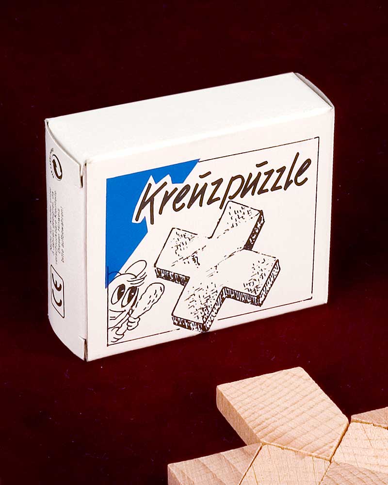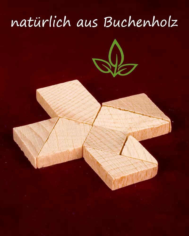Kreuzpuzzle aus Naturholz, bestehend aus acht Teilen. Geeignet für Kinder ab 8 Jahren.