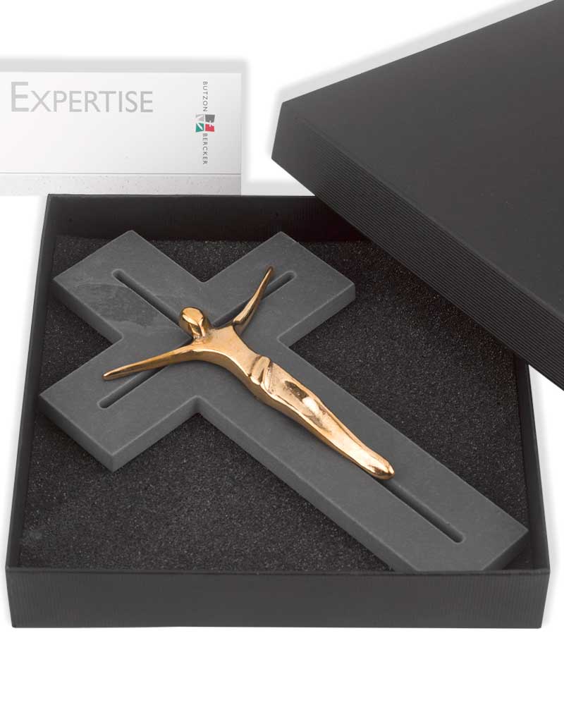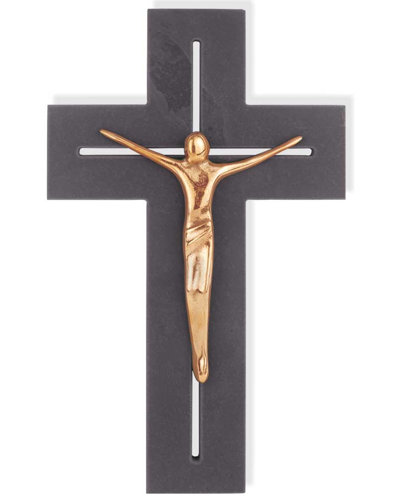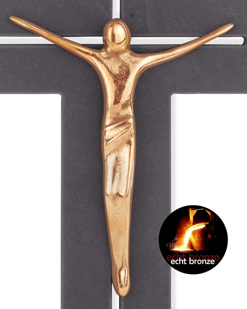 Wandkreuz aus natürlichem Schieferstein, 13 x 22 cm, solide Ausführung filigran durchbrochen, moderner Christuskörper aus polierter Bronze, appliziert.