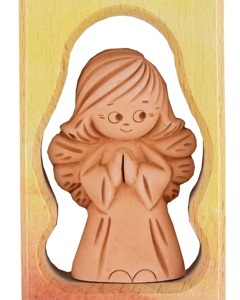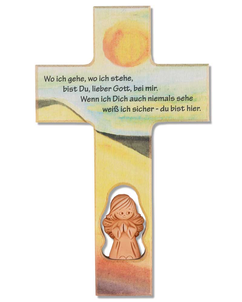 Schutzengelkreuz zur Wandbestigung, aus natürlichem Buchenholz, 20 cm x 12 cm. In einem durchbrochenen Bogen, steht eine filigran ausgearbeitetete Schutzengelfigur, aus modeliertem Ton. Kreuz mit farbiger Aufdruck und Segensspruch.