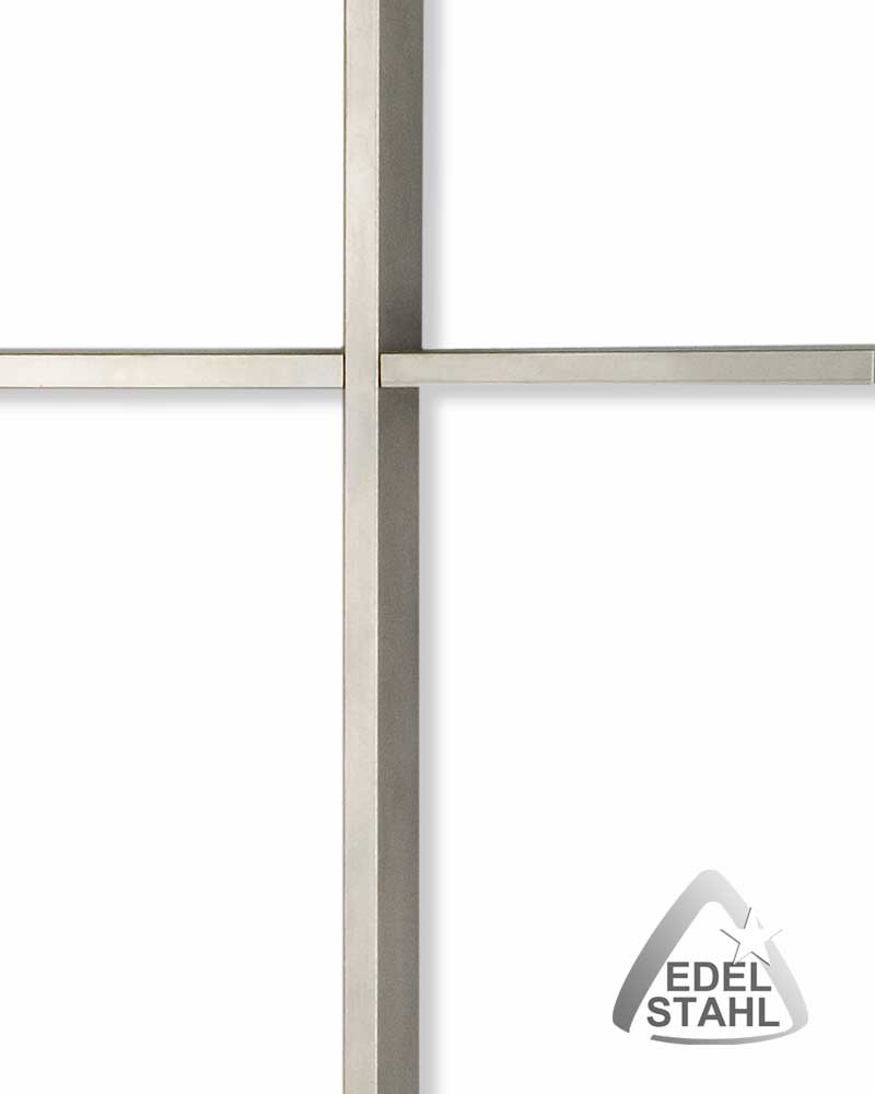 Edelstahlkreuz in schlichter Ausführung, 30 x 14 cm, Kreuzbalken aus mattem Edelstahl, Vierkant, 5 x 20 mm, mit verdeckt liegender Aufhängung für die Wandmontage.