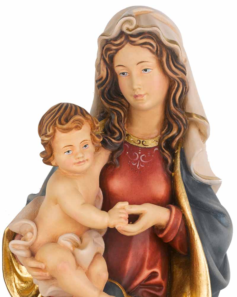 Bergmadonna mit Jesuskind, 20 cm coloriert. Diese Heiligenfiguren werden im südtiroler Grödnertal hergestellt und mit Echtheitszertifikat geliefert. Aus Lindenholz geschnitzt, wird die Oberfläche in liebevoller Handarbeit mit hochwertigen Farben bemalt.