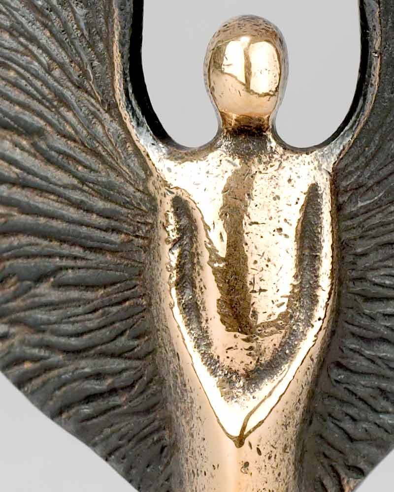 Engel in Bronze gegossen und glatt poliert, 9 cm hoch. Ausführung mit großen Flügeln in fein strukturierter Oberfläche, dunkel patiniert. Lieferung mit Expertise. Hochwertige Ausführung aus Deutschen Werkstätten.