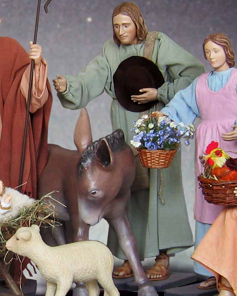In alter Tradition befinden sich in Kirchen Krippenfiguren mit beweglichen Körpern und handgeschnitzten Gliedmaßen. Mit dieser Krippe möchten wir diese Tradition fortsetzen, und bieten Ihnen hochwertige Handwerkskunst mit liebevoller Detailarbeit. Die Körper wurden von einem Schreiner angefertigt und lassen sich durch den beiliegenden Schraubenschlüssel in die gewünschte Form bringen. Köpfe, Hände und Füße sind komplett von Hand geschnitzt und coloriert. Alle Kleider, Umhänge und Schals wurden in harmonischen Farben genau auf die Figuren abgestimmt. Das Verhältnis von Preis und Leistung ist beispielgebend. Hirte mit Hut. 120 cm