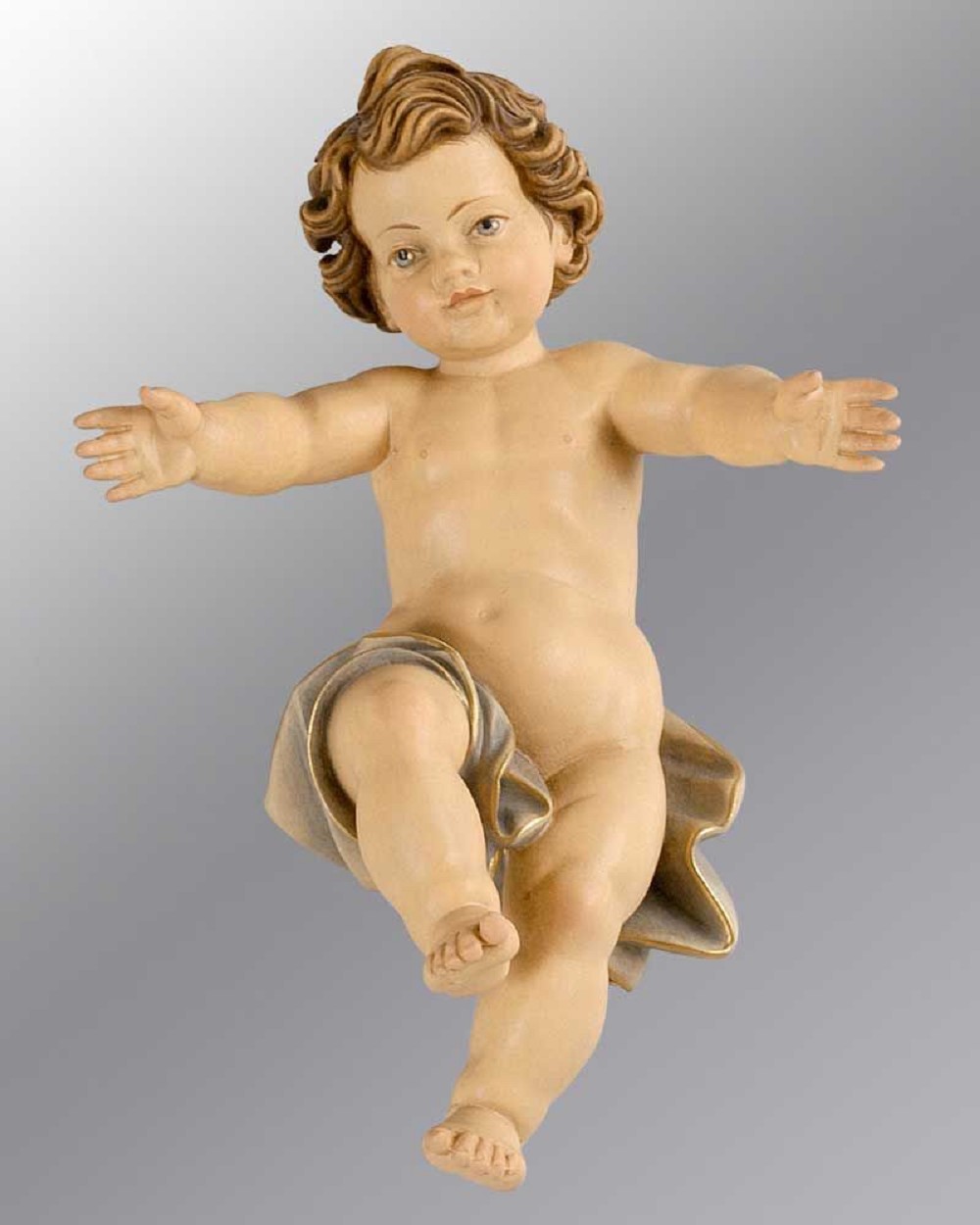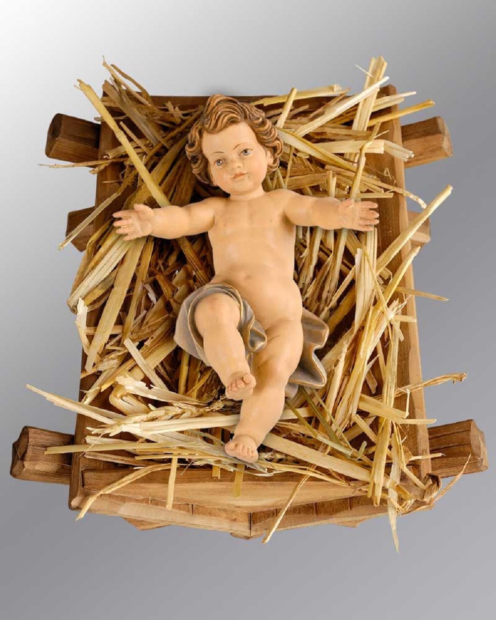 Jesuskind holzgeschnitzt und handcoloriert, mit braun gebeizter Wiege.