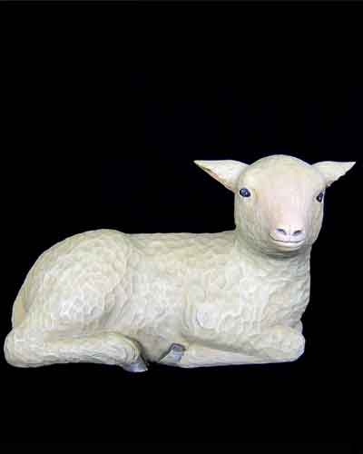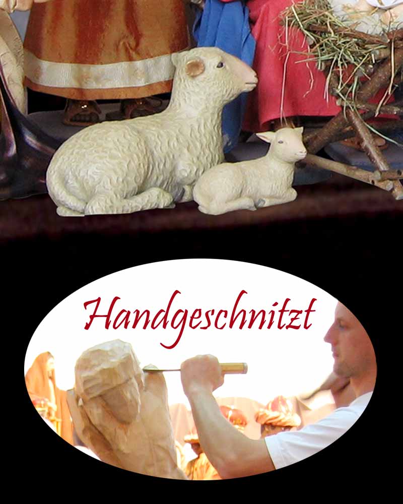 In alter Tradition befinden sich in Kirchen Krippenfiguren mit beweglichen Körpern und handgeschnitzten Gliedmaßen. Mit dieser Krippe möchten wir diese Tradition fortsetzen, und bieten Ihnen hochwertige Handwerkskunst mit liebevoller Detailarbeit. Die Körper wurden von einem Schreiner angefertigt, sind komplett von Hand geschnitzt und coloriert. Lamm liegend - passend zu 60 cm-Figuren