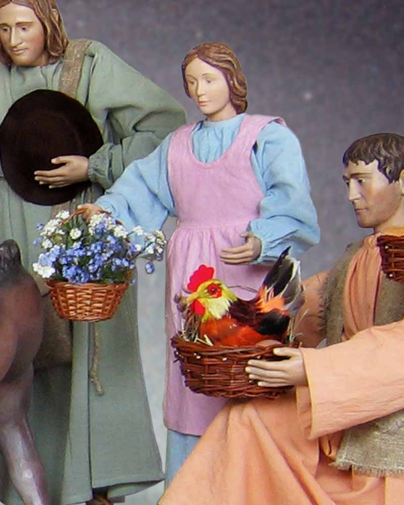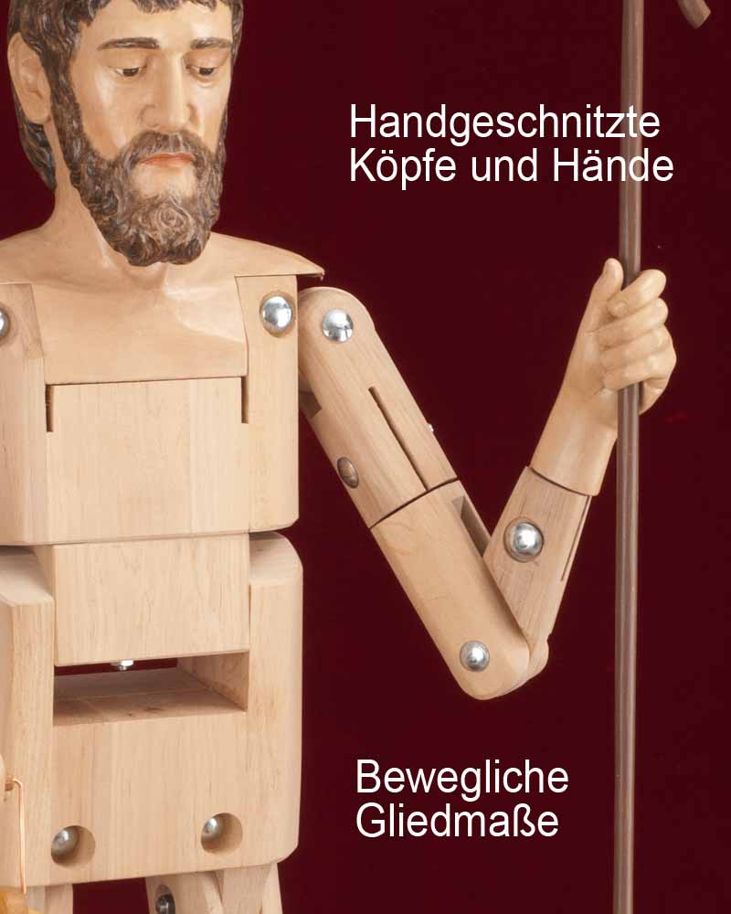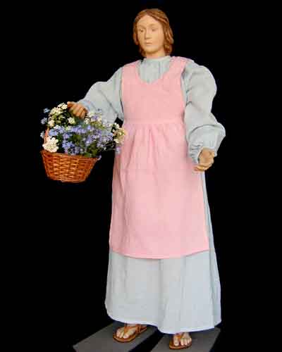 In alter Tradition befinden sich in Kirchen Krippenfiguren mit beweglichen Körpern und handgeschnitzten Gliedmaßen. Mit dieser Krippe möchten wir diese Tradition fortsetzen, und bieten Ihnen hochwertige Handwerkskunst mit liebevoller Detailarbeit. Die Körper wurden von einem Schreiner angefertigt und lassen sich durch den beiliegenden Schraubenschlüssel in die gewünschte Form bringen. Köpfe, Hände und Füße sind komplett von Hand geschnitzt und coloriert. Alle Kleider, Umhänge und Schals wurden in harmonischen Farben genau auf die Figuren abgestimmt. Das Verhältnis von Preis und Leistung ist beispielgebend. Magd mit Blumenkorb - passend zu 180 cm-Figuren