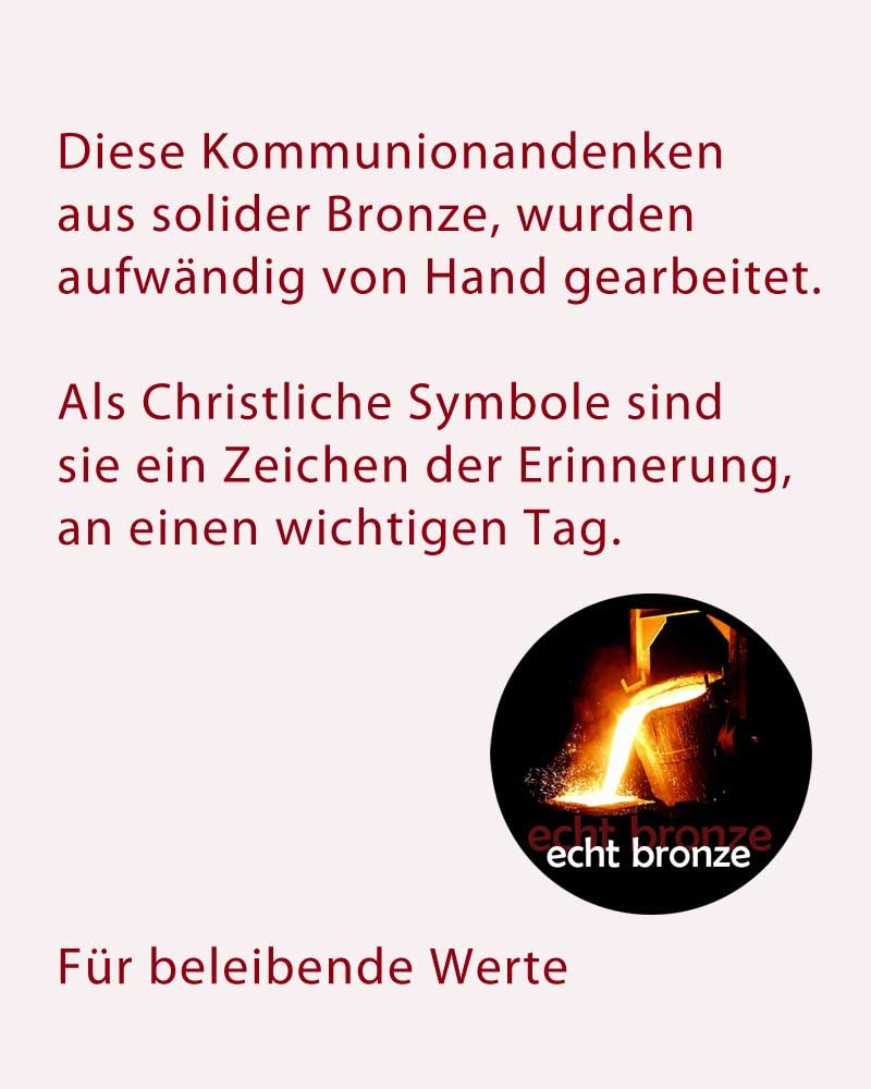 Die Oberfläche der Kommunionandenken ist patiniert und anschließend poliert. Ein transparenter Schutzlack verhindert Oxydation. Die Lieferung der Bronzekreuze erfolgt in einer kostenlosen Einzelverpackung mit einem Kommunionaufkleber. Erstkommunionandenken aus solider Bronze sind anspruchsvolle Geschenke mit bleibendem Wert und Zeichen der Erinnerung. Die einfach gestaltete Symbolik und Formensprache wurde auf die Vorbereitung der Erstkommunion abgestimmt. Exclusiv nur bei Schreibmayr erhältlich.
