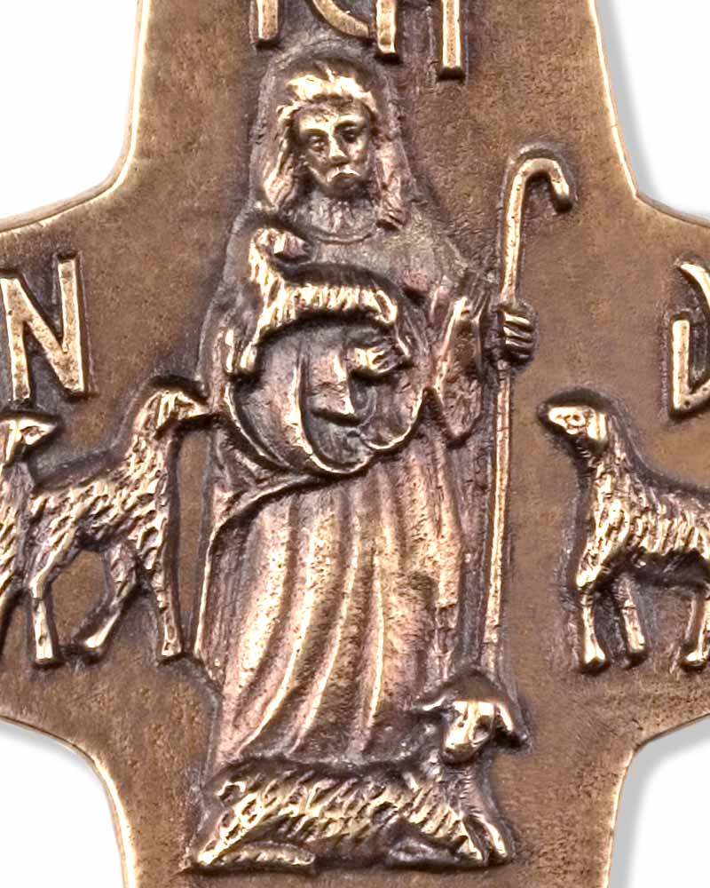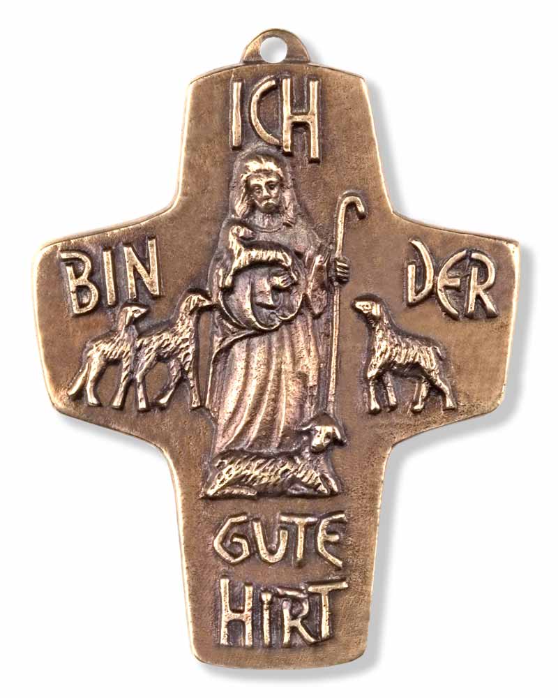 Kommunionkreuz, 7,5 x 9,5 cm. Das Relief zeit eine Darstellung von Jesus Christus als guter Hirte, mit seiner einer Schafherde, Inschrift "Ich bin der gute Hirte".