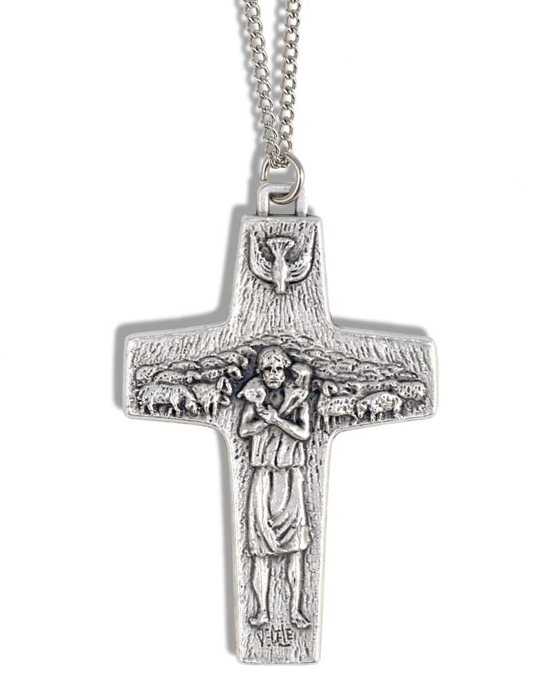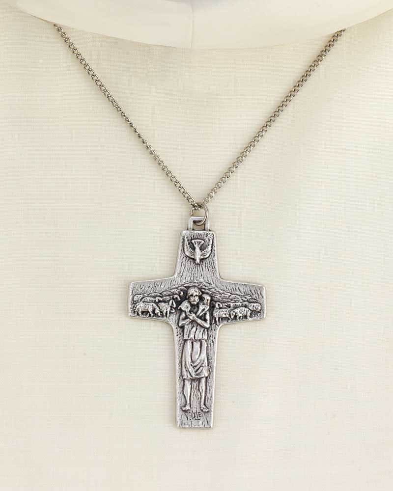 Das beliebte Pektorale von Papst Franziskus „Guter Hirte“ erhalten sie jetzt auch in einer kleinen Ausführung mit venezianischer Umhängekette und praktischer Geschenkverpackung, 7 x 5 cm, Relief in versilbert oxydierter Ausführung.