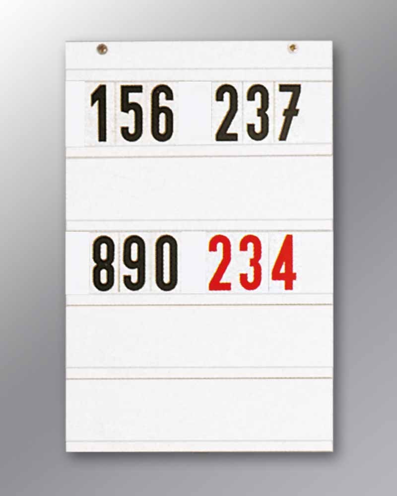 Liednummerntafel aus weißem Polystytrol, kratz und stoßfest, 7 - zeilige Ausfürung, 450 mm breit, 955 mm hoch.