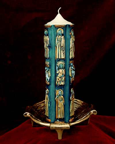 Kerze elfenbein mit 10 % Bienenwachs, Wachsrelief dunkelblau, mit goldenem Apostelmotiv, 300/90 mm.