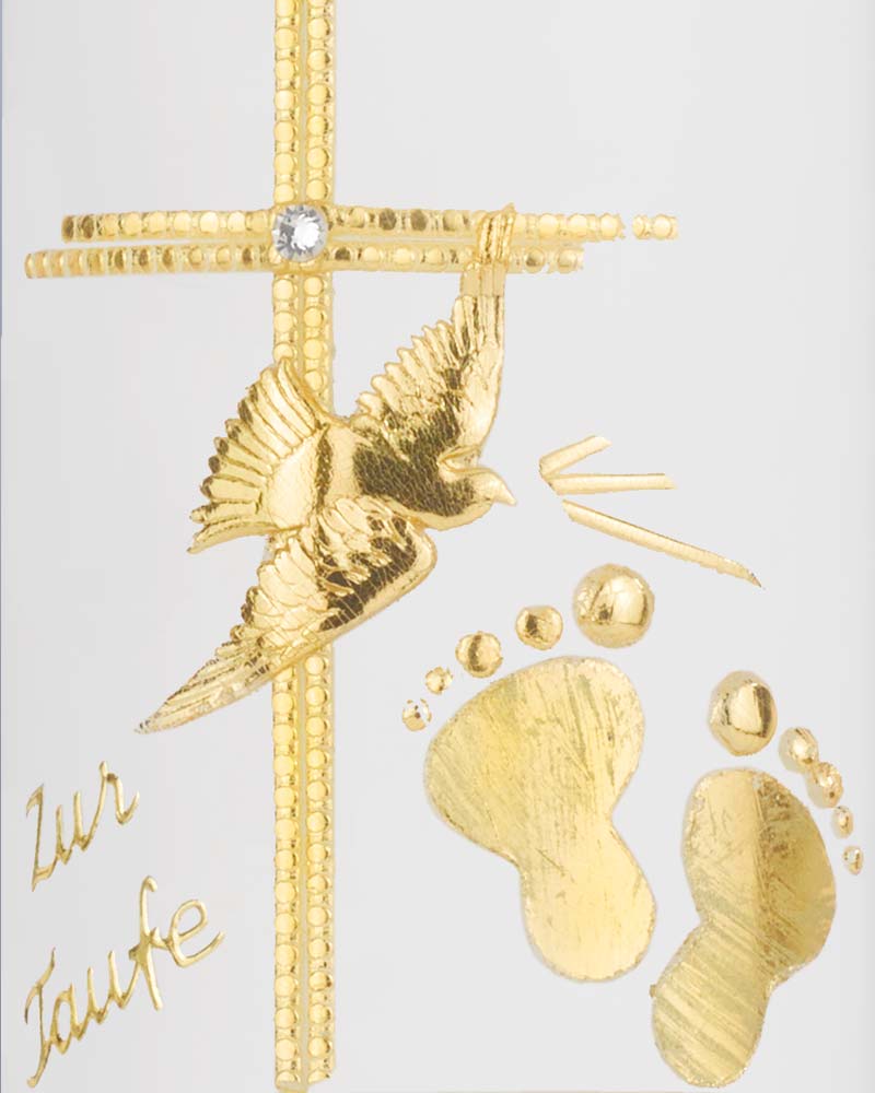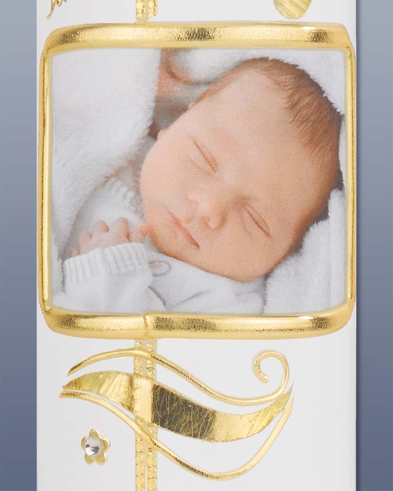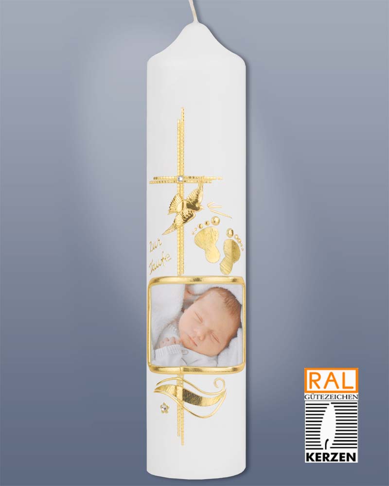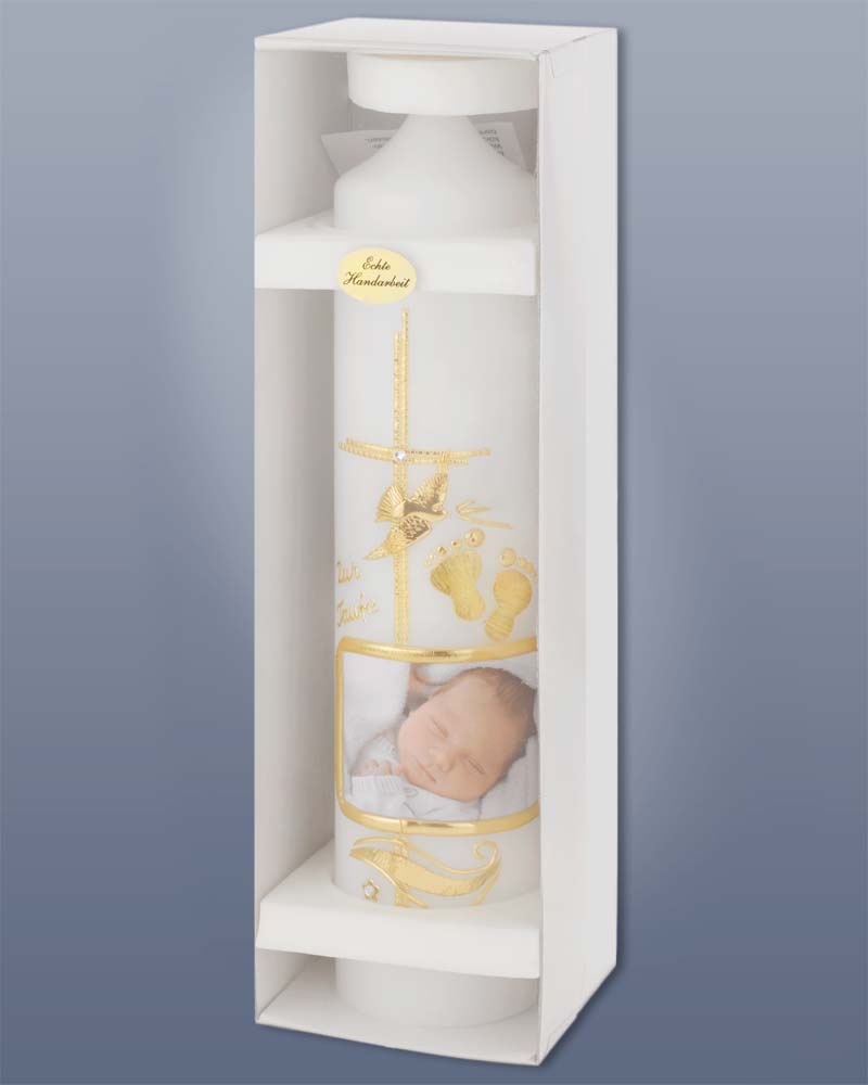 Die Kerze 265 x 60 mm wird nach Wunsch mit dem Foto des Taufkindes bedruckt. Das Foto wird von einer goldenen Wachsapplikation umrahmt. Kreuzmotiv mit Glasstein in der Mitte, Fußabdrücke, fliegende Taube mit Aufschrift "Zur heiligen Taufe". Hochwertige Kerzen aus deutschen Werkstätten mit RAL Zertifikat. Für das Foto brauchen wir dann eine digitale Vorlage von Ihnen.