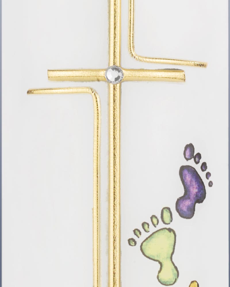 Die Kerze 265 x 50 mm ziert ein goldenes Kreuz mit einem Glasstein in der Mitte. Bunte Fußabdrücke wandeln hinaus, untermalt von Wassersymbolik und A+O. Hochwertige Kerzen aus deutschen Werkstätten mit RAL Zertifikat.
