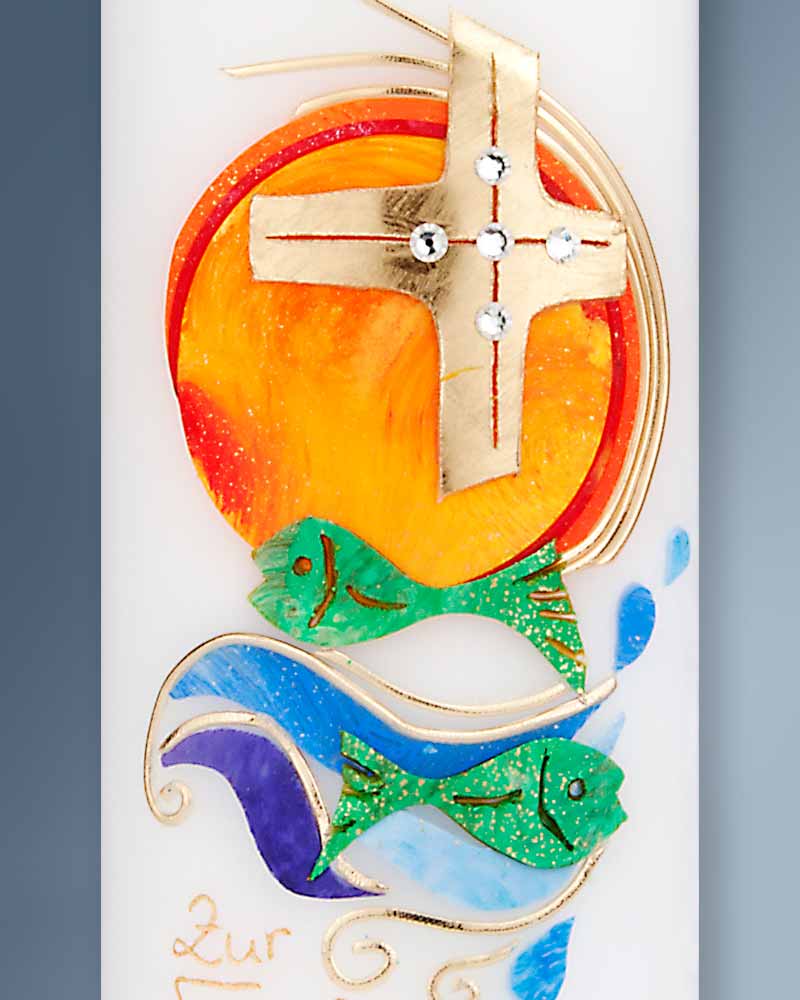 Der Fisch begegnet uns als Symbol für Jesus Christus schon seit vielen Jahrhunderten. Es wird angenommen, dass die Christen ihn bei der Verfolgung als Geheimzeichen verwendeten haben. Als Taufsymbolm und Glaubenszeichen erfreut sich der Fisch heute wieder großer Beliebtheit. Die nachfolgend angebotenen Taufkerzen zeigen die Verbindung mit einem Wassersymbol und Kreuzzeichen.