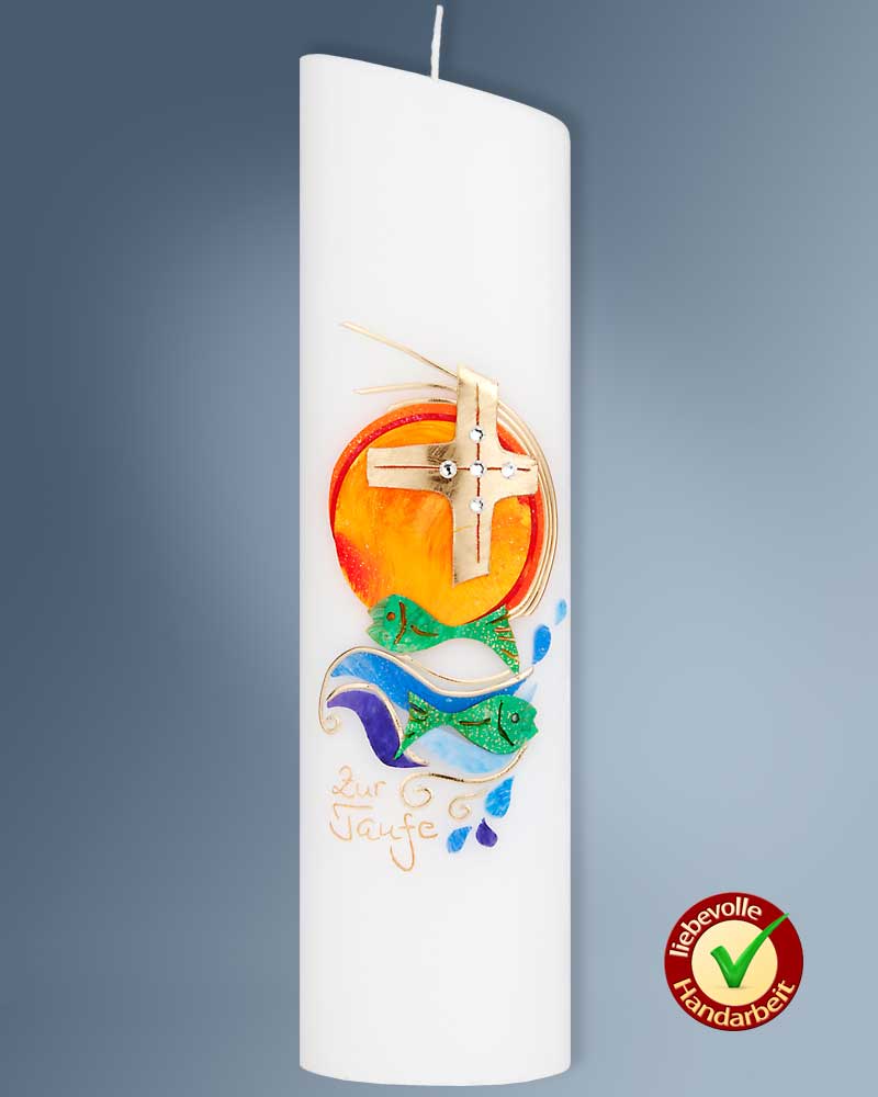 Taufkerze "Lumen Christi", oval, 240 mm hoch. Das goldene Kreuzsymbol mit Swarovskikristallen und aufgehender Sonne sind enbenso wie die Fischapplikationen, Zeichen für Jesus Christus. Die Wellen und Wassersymbolik sind Ausdruck der Taufe, goldene Schriftzug "Zur Taufe".