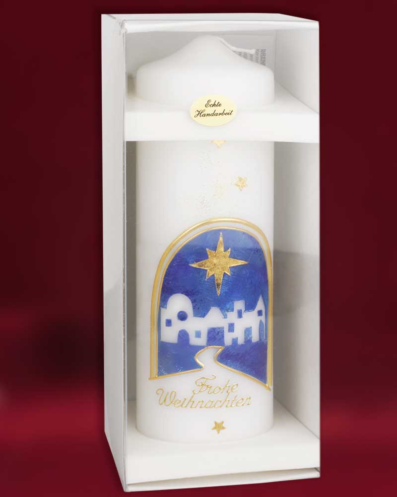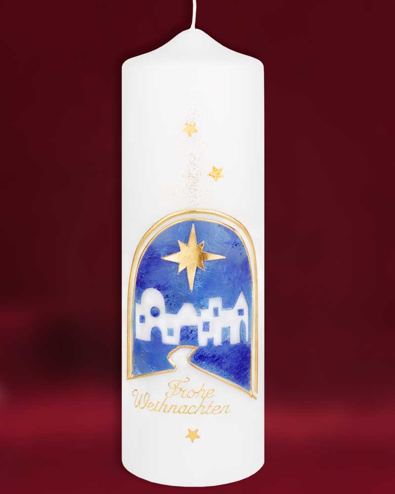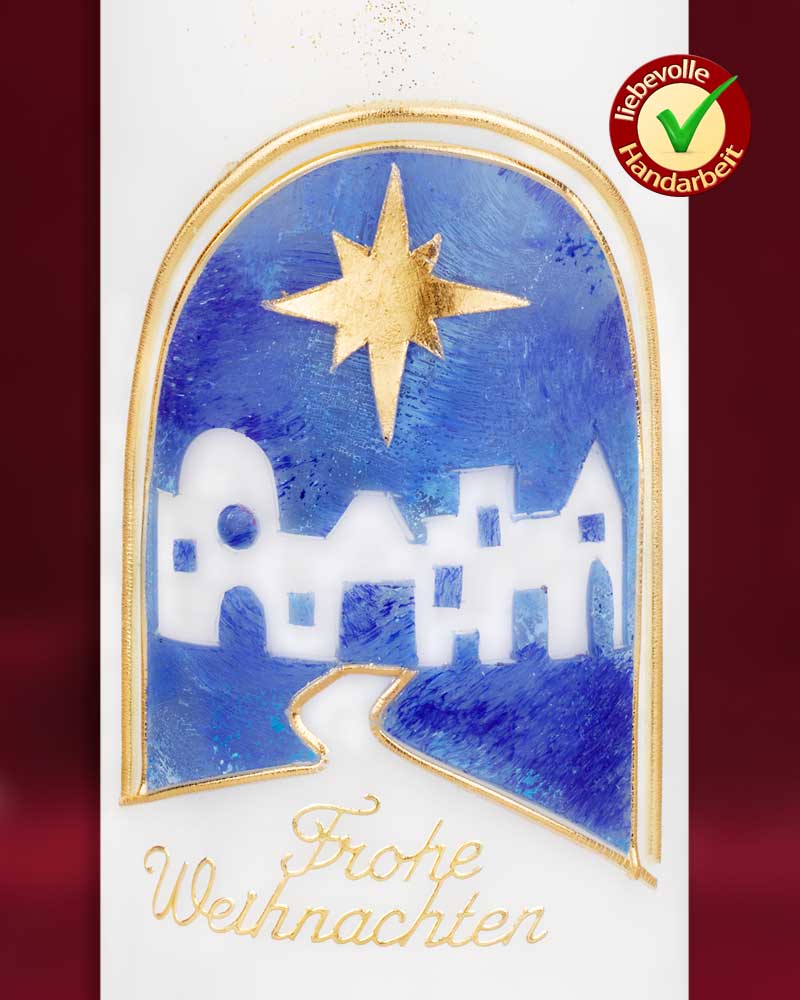 Kerze aus Ceresin Wachs 225 x 70 mm von Hand verziert. Das Motiv zeigt Bethlehem in ruhigem blau und darüber den Stern von Bethlehem in gold. Hochwertige Kerzen aus deutschen Werkstätten mit RAL Zertifikat.