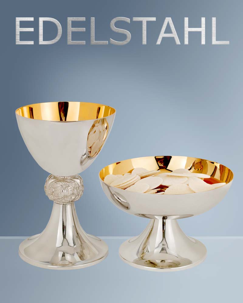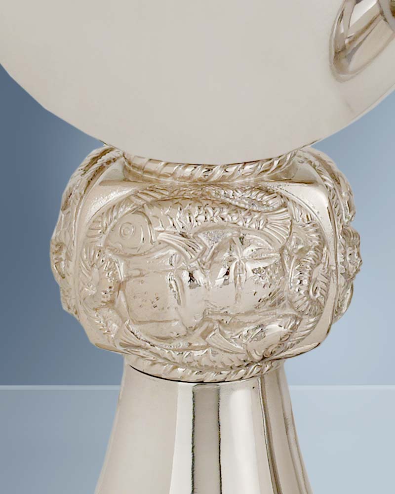 Kelch aus Edelstahl, versilbert und poliert, 18cm hoch, Cuppa innen vergoldet 11,5cm Ø. Mit Nodus Fisch und Brot.