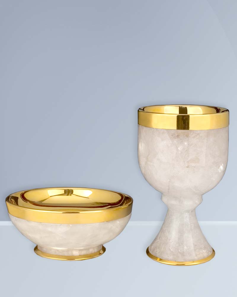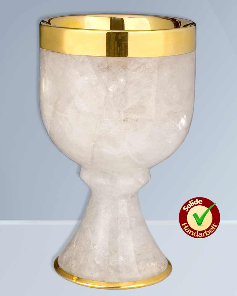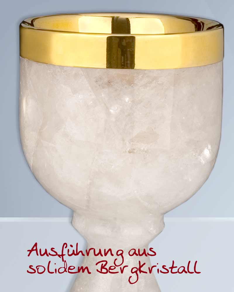 Kelch in klassischer Form, mit abgesetztem Nodus, 15 cm hoch, aus echtem Bergkristall, Cuppa Echtsilber, vergoldet, poliert, 9 cm Ø.