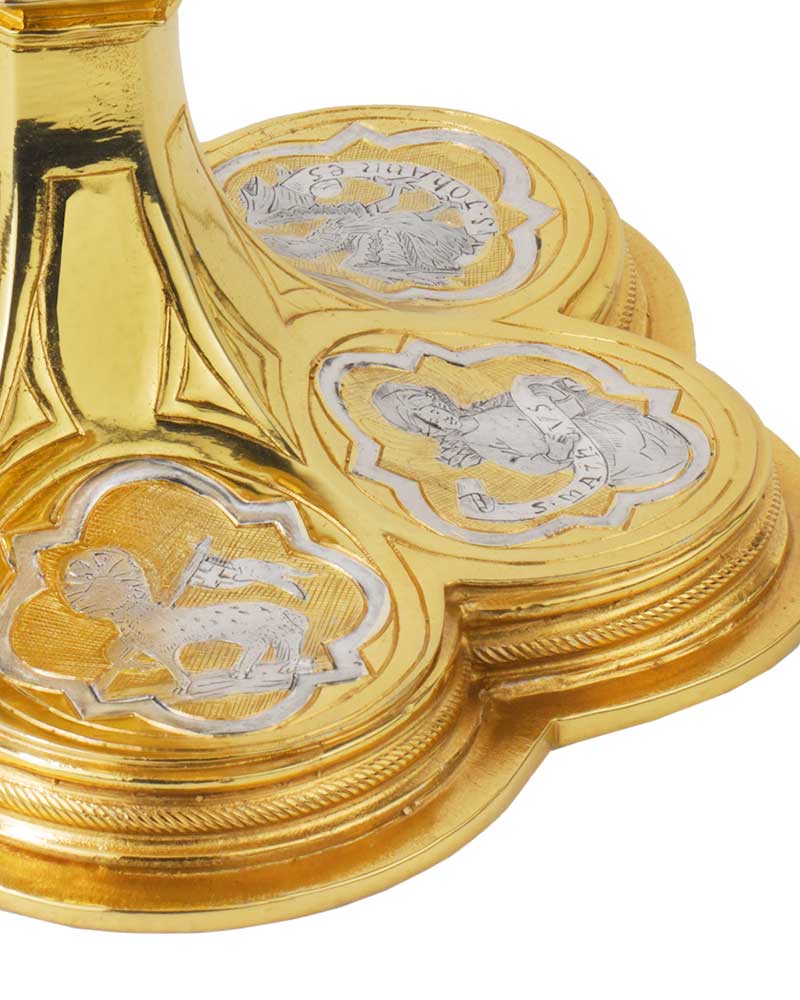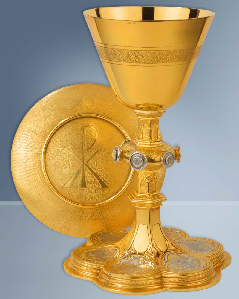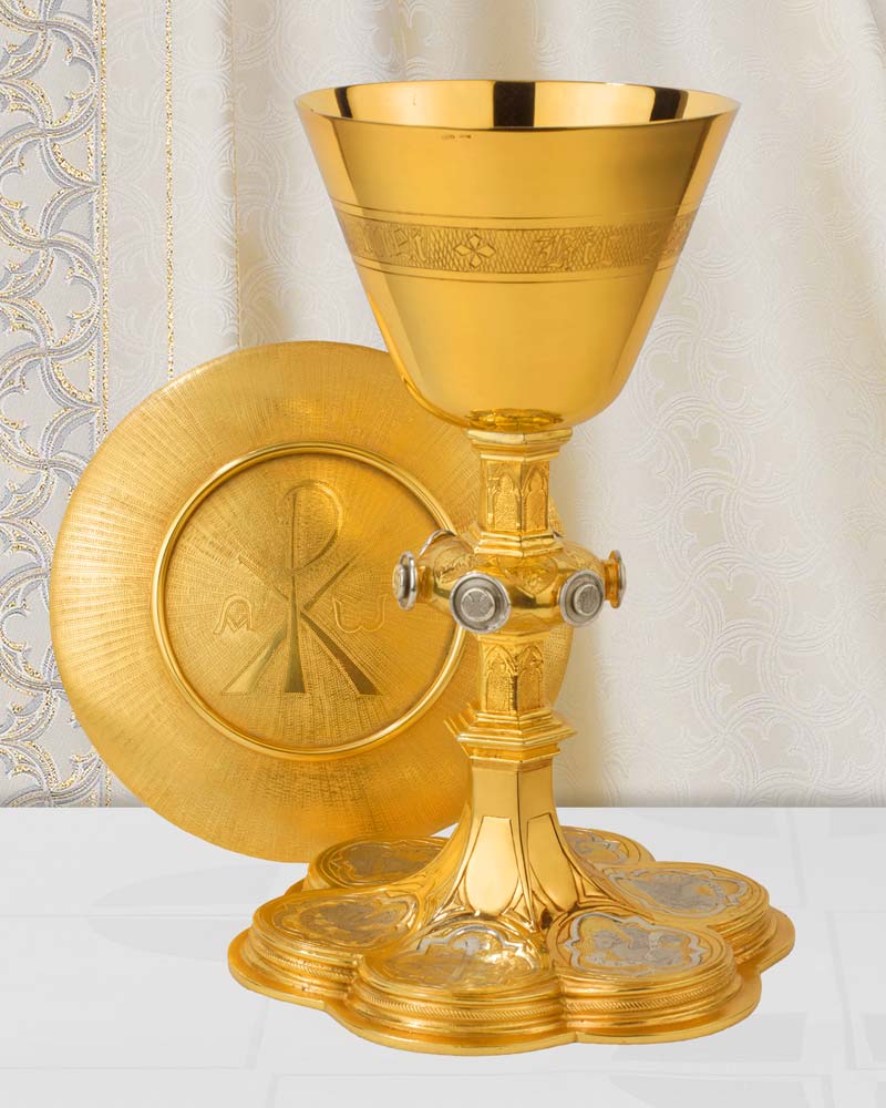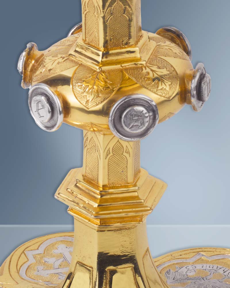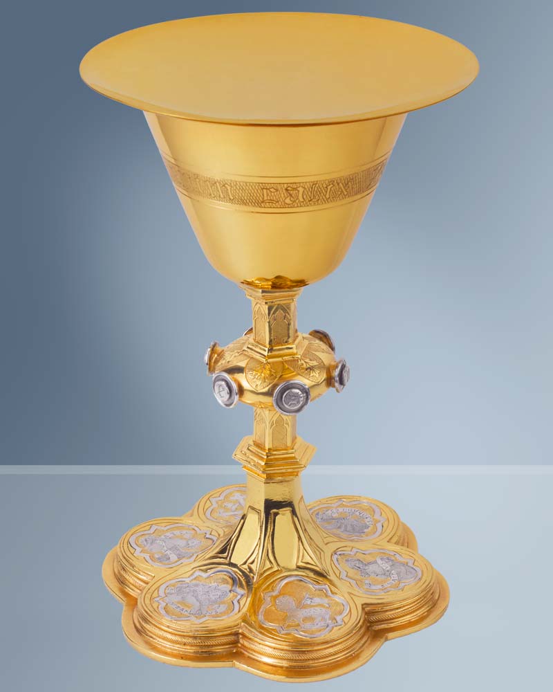 Der gotische Kelch hat eine Gesamthöhe von 23 cm und zeichnet sich durch seine klassische Form aus. Die Cuppa aus Sterling Silber misst 11,5 cm im Durchmesser und bietet ein angemessenes Volumen für den Gebrauch. Der breite Fuß mit 15,5 cm Durchmesser gewährleistet Stabilität. Die gotische Formgebung verleiht dem Kelch eine zeitlose Ästhetik, die sich harmonisch in traditionelle Kirchenräume einfügt. Das hochwertige Sterling Silber garantiert Langlebigkeit und einen edlen Glanz. Dieser Kelch eignet sich hervorragend für die Eucharistiefeier und andere sakrale Zwecke. Die sorgfältige Verarbeitung und die ausgewogenen Proportionen machen ihn zu einem würdigen Gefäß. Als wertvolles Gerät ist er auch eine angemessene Geschenkidee für Geistliche oder Gemeinden.