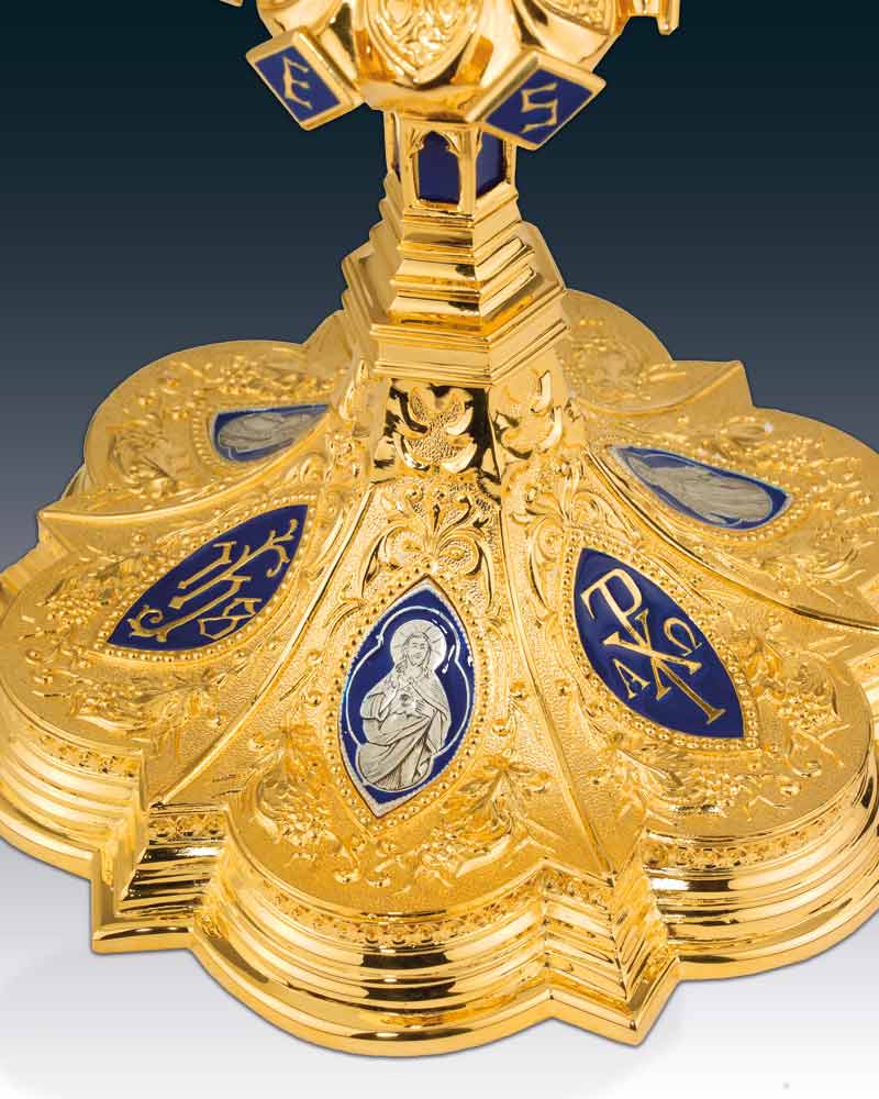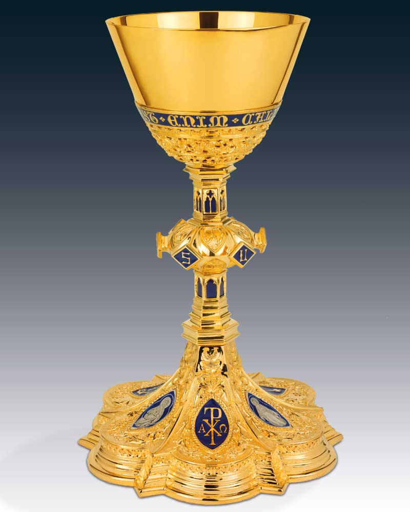 Kelch in gotischer Ausführung, Messing vergoldet, 25 cm hoch, mit blauen Emailarbeiten. Diese Reproduktion eines alten Originales trägt auf der Cuppa, mit 11 cm Ø, die Inschrift, "Hic est enim calix sanguinis mei" "Das ist der Kelch meines Blutes" Auf dem Nodus sind die Buchstaben für JESUS zu lesen. Der Standfuß wird geziert von versilberten Medaillons der Hl. Maria Mutter Gottes, dem Joseph mit Lilien und einer Herz Jesu Darstellung.