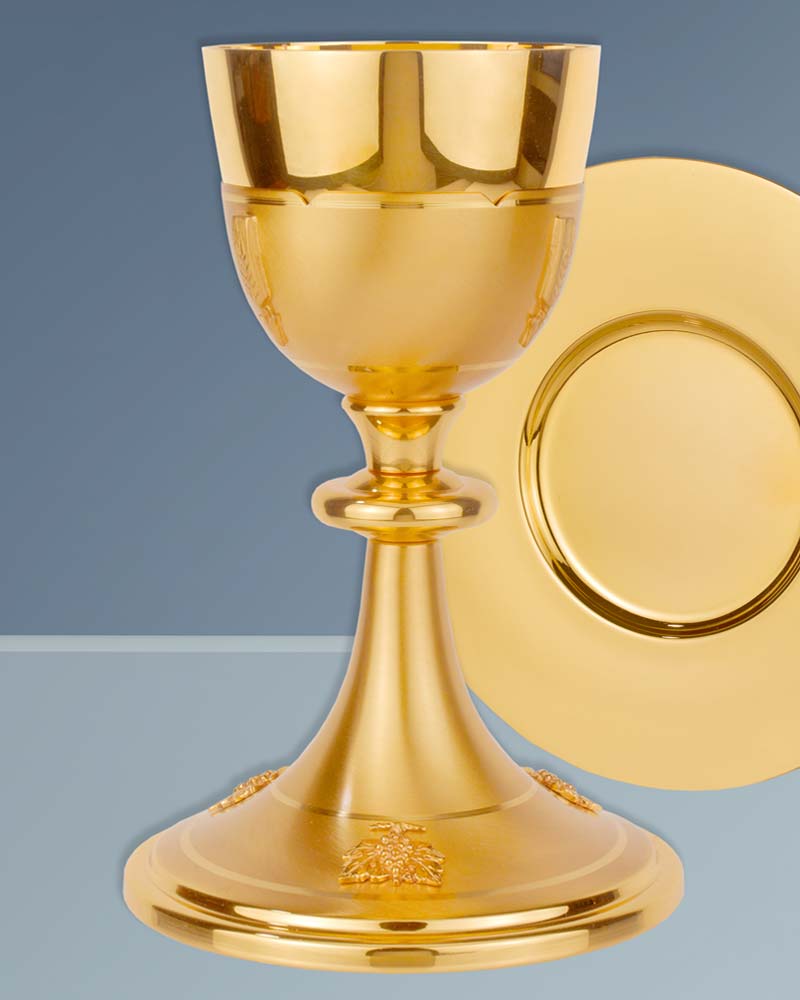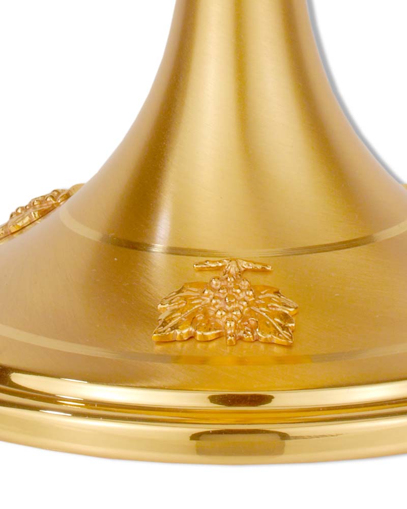 Kelch mit klassisch barocker Formgebung, matt vergoldet, inclusive Nodus 20,5 cm hoch. Die Cuppa, mit Ährensymbolik, hat 9 cm Ø, der sichere Standfuß ist mit kleinen Weintraubenmedaillions geschmückt.