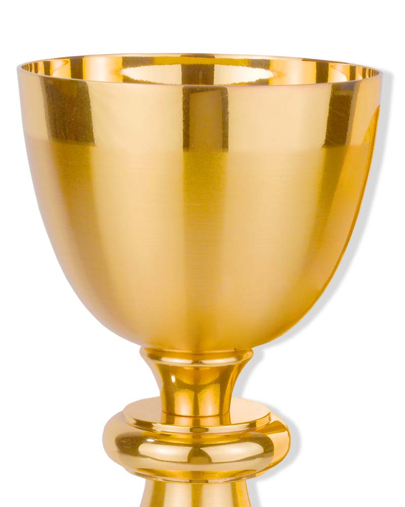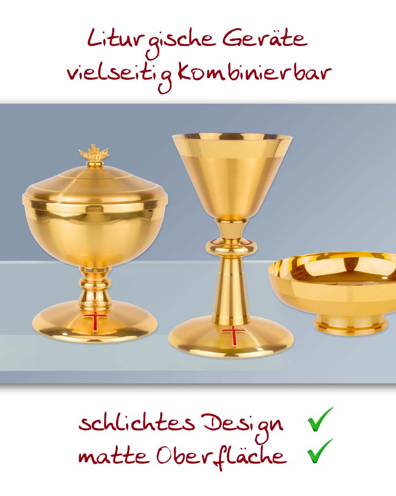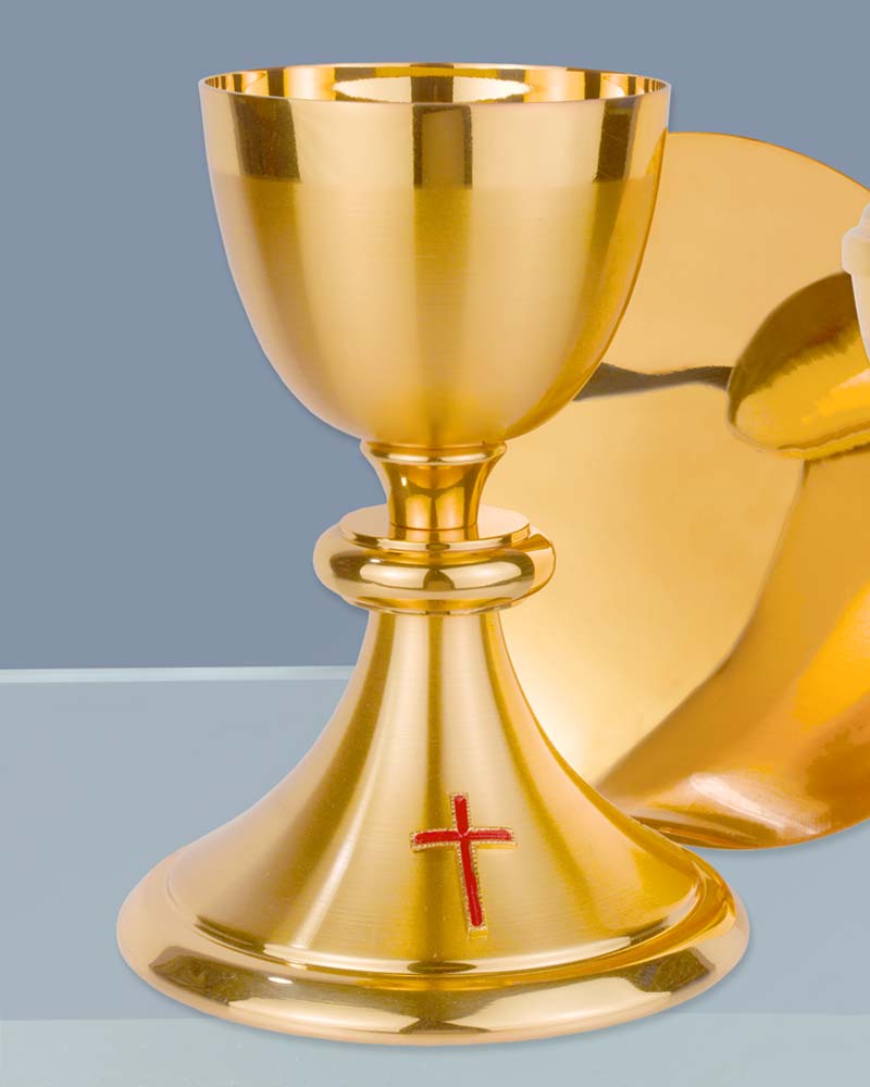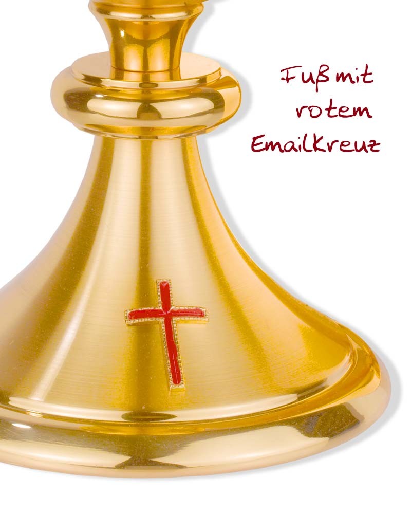 Kelch in klassischer Form, mit Nodus, 19 cm hoch. Die Cuppa hat 9 cm Ø, die Bodenplatte ziert ein Kreuz mit rotem Email, standfester Fuß mit 13 cm Ø. In hochwertiger, solider Handarbeit gefertigt.