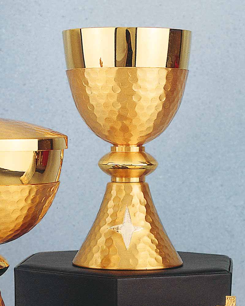 Kelch gehämmert, vergoldet, 17 cm hoch, Einsatzcuppa poliert, 9 cm Ø. Die Oberfläche ist matt, gehämmert, vergoldet und anlaufgeschützt. Das erspart Ihnen aufwändige Pflege und hässliche Fingerabdrücke. Auch als preisgünstige Ergänzung vorhandener Geräte sehr zu empfehlen.