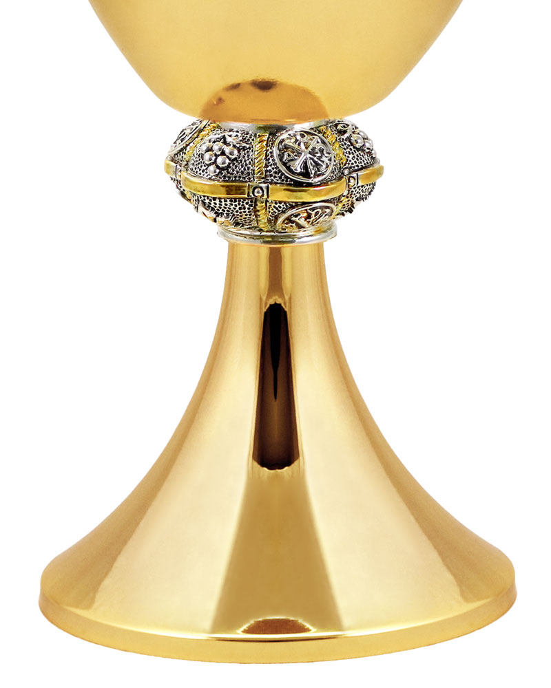 Dieser liturgische Kelch aus hochwertigem Messing ist außen matt versilbert und besitzt eine innen polierte, vergoldete Cuppa mit 10 cm Durchmesser. Die Gesamthöhe beträgt 20 cm. Der kunstvoll gestaltete Nodus mit feiner Ornamentik bietet guten Halt beim Zelebrieren und unterstreicht die klassische Formgebung. Die matte Oberfläche ist unempfindlich gegen Fingerabdrücke und leicht zu reinigen. Zum Lieferumfang gehört eine passende Patene mit 14 cm Durchmesser. Gefertigt in traditioneller Handarbeit, eignet sich der Kelch für den regelmäßigen Einsatz im liturgischen Dienst.