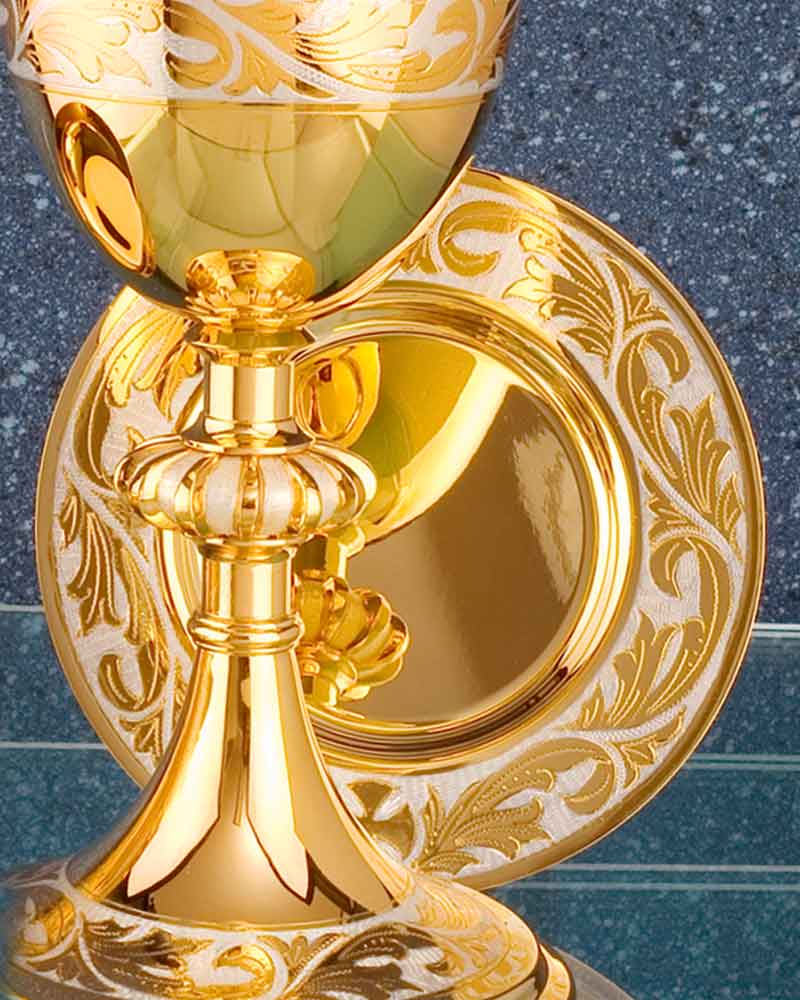 Kelchpatene mit großer Vertiefung, für ca. 40 Brothostien, 16 cm Durchmesser. Das auf dem Rand eingravierte, barocke Schmuckband hebt sich durch eine Zierversilberung wirkungsvoll vom vergoldeten Grundmaterial ab.