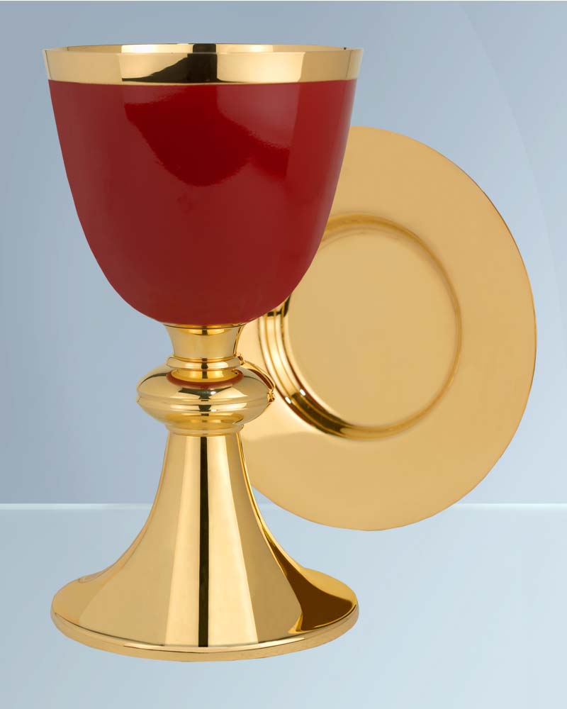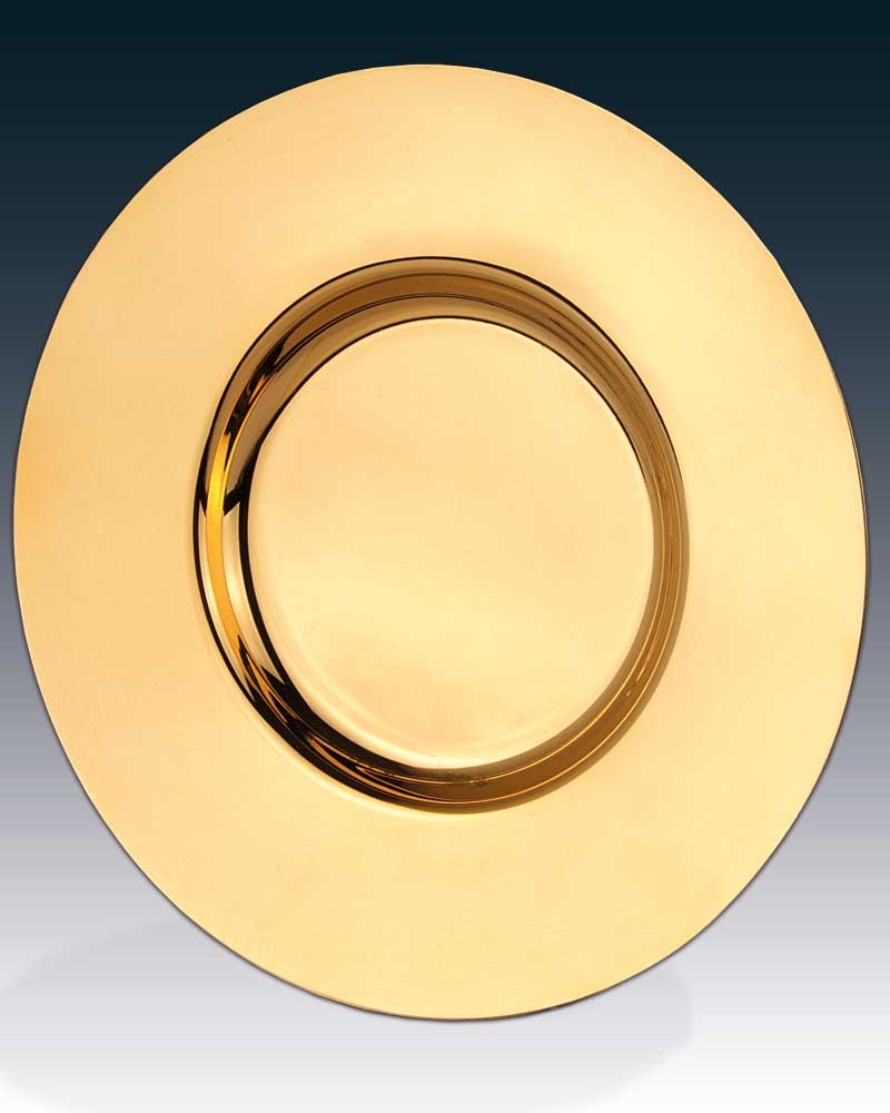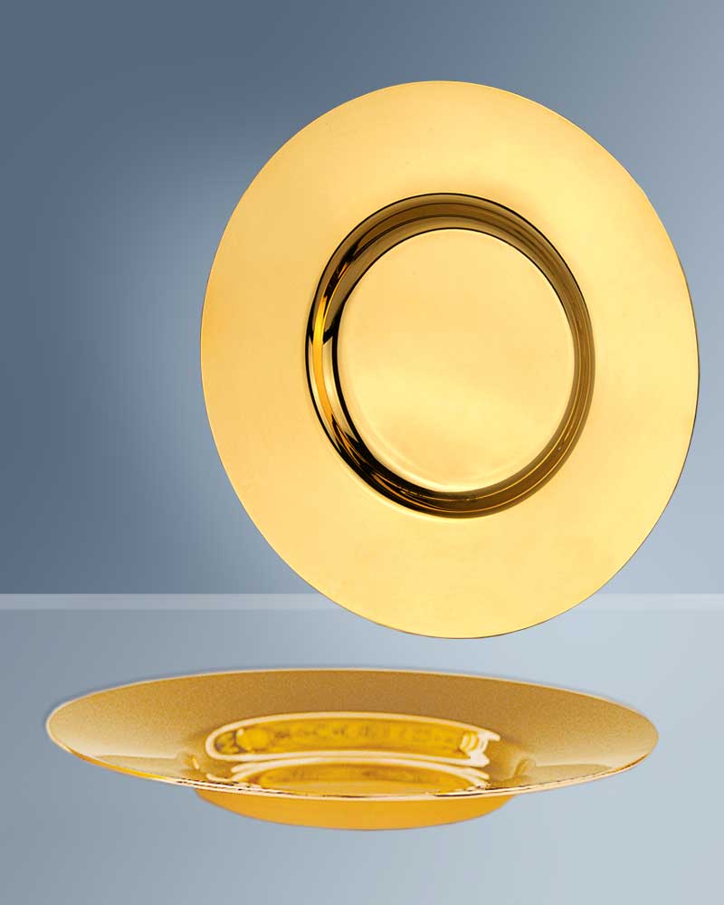 Kelchpatene in klassischer, tiefer Tellerform, 16 cm Ø, Messing poliert und vergoldet, 1,5 cm Ø. Die Vertiefung hat 8 cm Ø und fasst ca. 20 Brothostien.