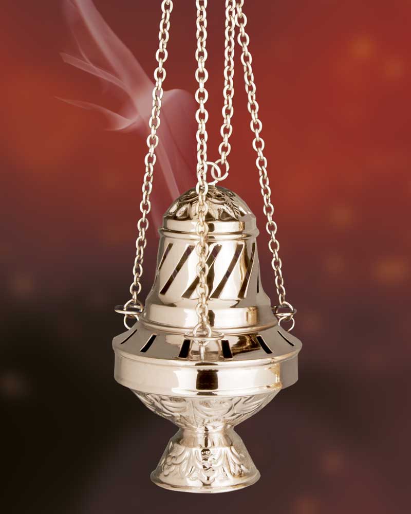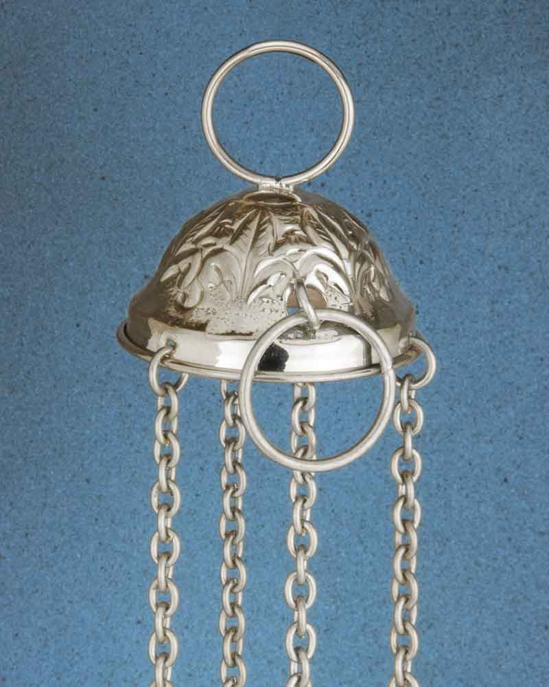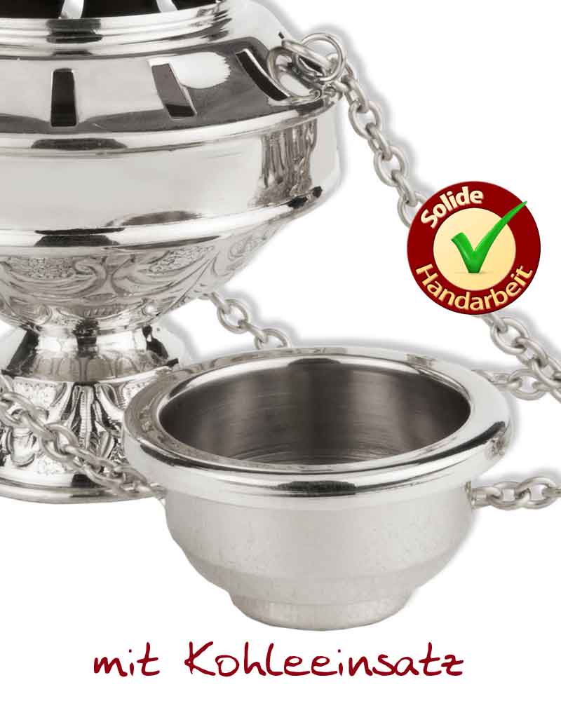Dieses Weihrauchfass "Butafomeiro" wurde von Hand, aus solidem Messing angefertigt und vernickelt. Die Höhe mit Deckel ist 17 cm, 11 cm Ø, die Ketten sind 50 cm lang. Es handelt sich hierbei um eine detailreich ausgearbeitete Reproduktion, in Anlehnung an das berühmte Rauchfass in Santiago de Compostella. Im Inneren befindet sich ein herausnehmbarer Einsatz um das Rauchfass vor der der glühenden Kohle zu schützen. Diese schöne Handarbeit, eignet sich gut für Sternsinger, als Ministrantengeschenk, oder auch für den privaten Gebrauch zum Haus ausräuchern.