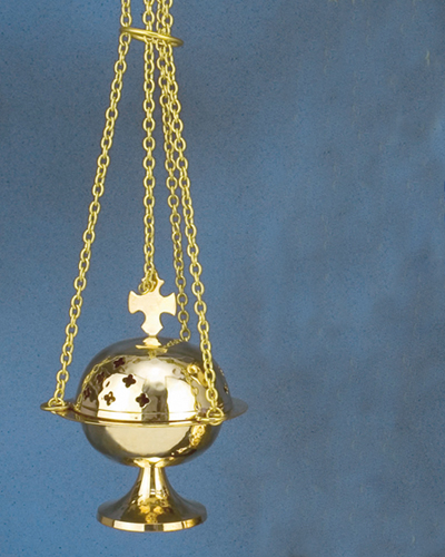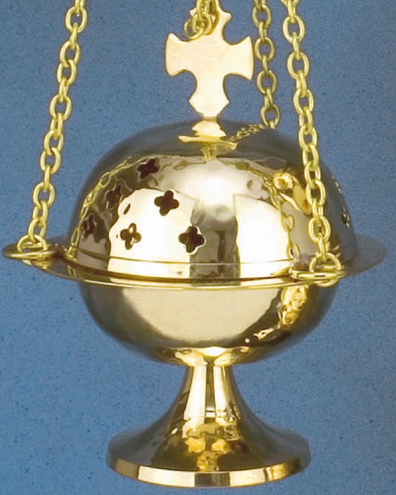 Rauchfass in Kugelform, 14 cm hoch und 11 cm Ø, mit praktischem Kohleeinsatz. Verarbeitung aus solidem Messingguß, gehämmert, poliert und anlaufgschützt. Das kleine, schlichte Rauchfass, eignent sich gut zum Haus ausräuchern, oder für Sternsinger.