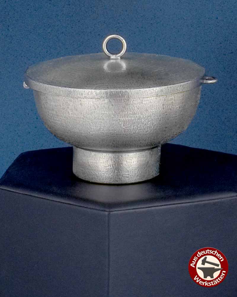 Rauchfass mit Spitzdach und Kohleeinsatz, 14,5 cm Ø, 16 cm hoch. Die fein strukturierte Oberfläche ist versilbert, oxydiert und gegen Anlaufen geschützt. Schiffchen mit Klappdeckel und Löfferl.