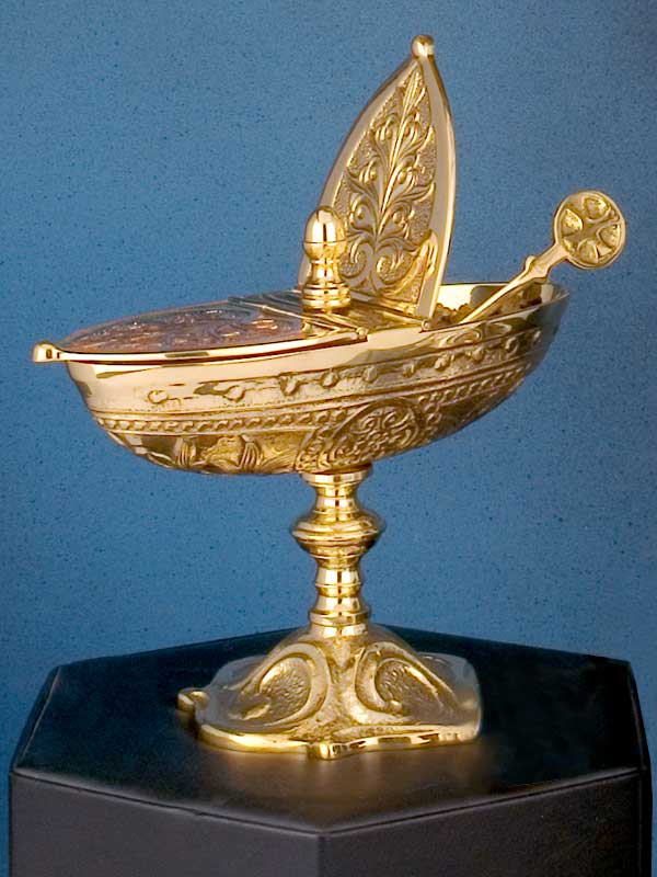 Weihrauchschiffchen aus Messing gegossen und poliert, 13 cm lang, gotische Form und Ornamentik anlaufgeschütz. Solide Ausführung mit Klappdeckel und passendem Weihrauchlöfferl.
