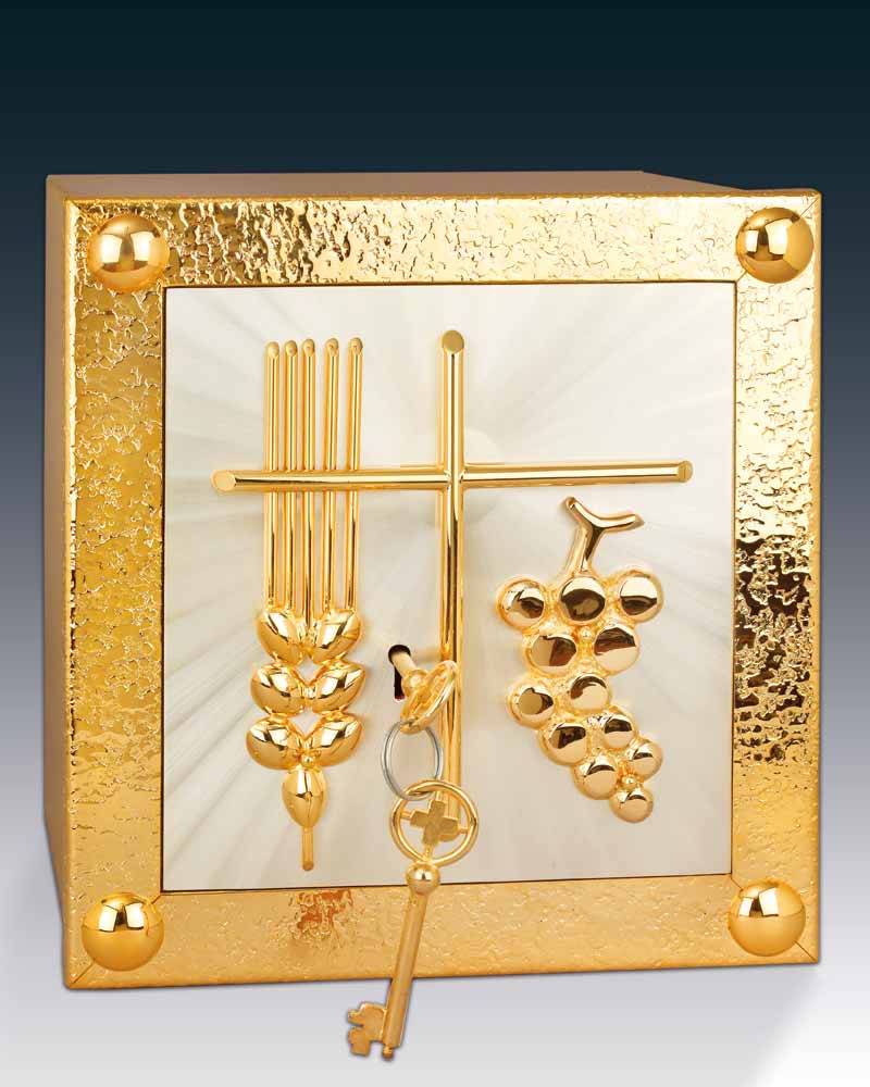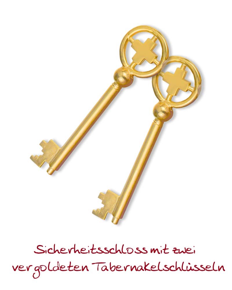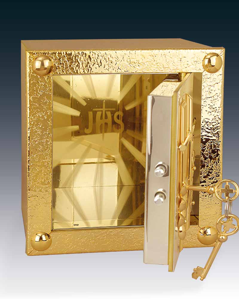Tabernakel aus Messing vergoldet. Die versilberte Deckplatte ist mit einem Kreuz und Trauben und Ähren verziert, Außenmaß 26 x 26 x 22 cm Tiefe. Tabernakel Innen vergoldet mit strahlendem IHS-Symbol auf der Rückwand.