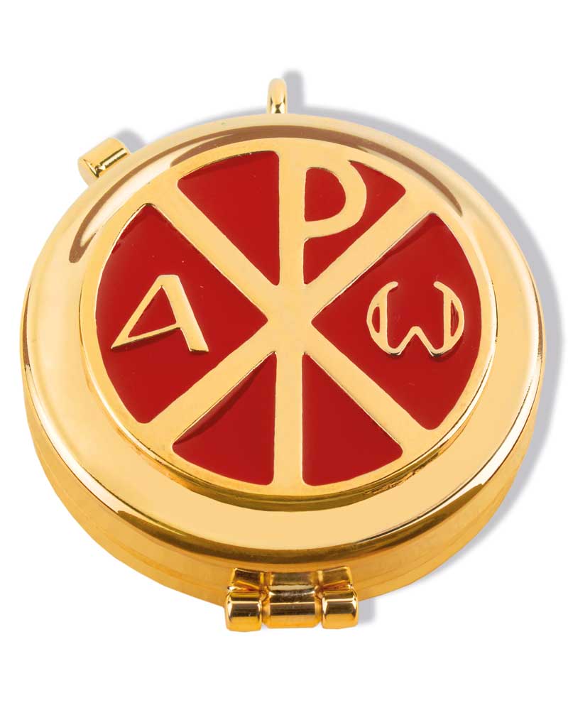 Schlichte Versehpatene aus Messing poliert und vergoldet. Die Pyxis ziert rotes Email mit PX Symbol und "A+O". Diese Hostiendose hat 5,5 cm Durchmesser und ist mit bis zu 10 Brothostien befüllbar. Durch das Schanier aufklappbar und leicht befüllbar, mit Ring zum Umhängen um den Hals.